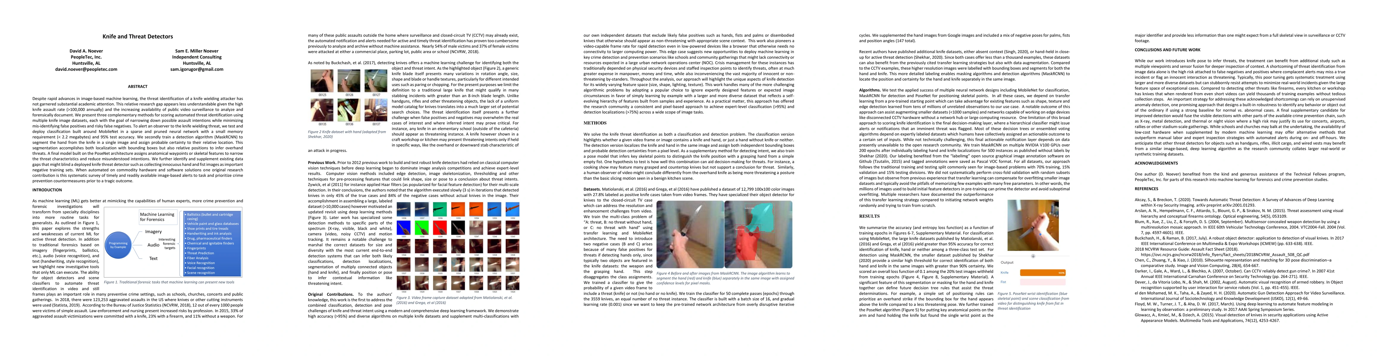 This paper presents three methods to improve automated threat identification of knife-wielding attackers using image-based machine learning. The methods include a MobileNet-based classifier, a MaskRCNN for segmentation, and a PoseNet model for anatomical analysis, all aimed at minimizing false positives and negatives. The research also addresses data gaps to enhance detection accuracy.