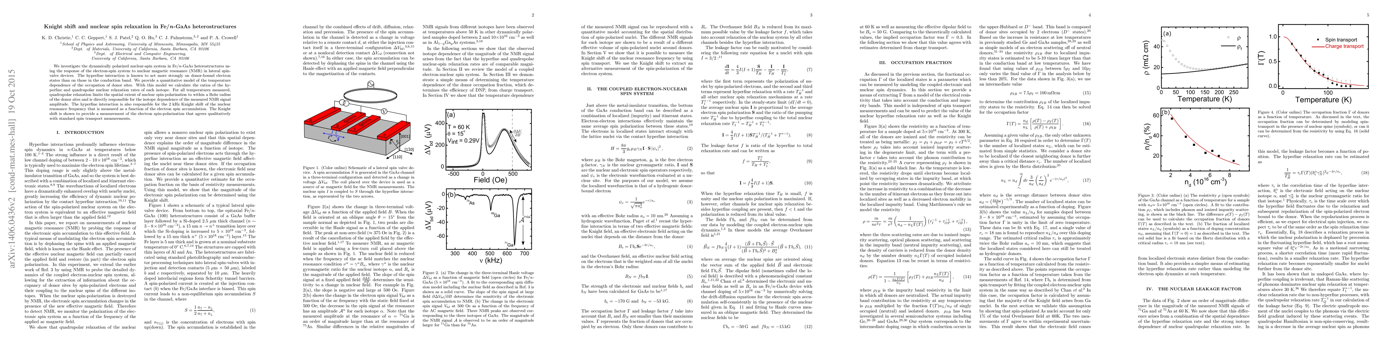 This paper explores the nuclear spin relaxation and Knight shift in Fe/n-GaAs heterostructures, revealing that quadrupolar relaxation confines nuclear spin polarization near donor sites. The hyperfine interaction explains the observed 2 kHz Knight shift and correlates electron spin-polarization with standard transport measurements.