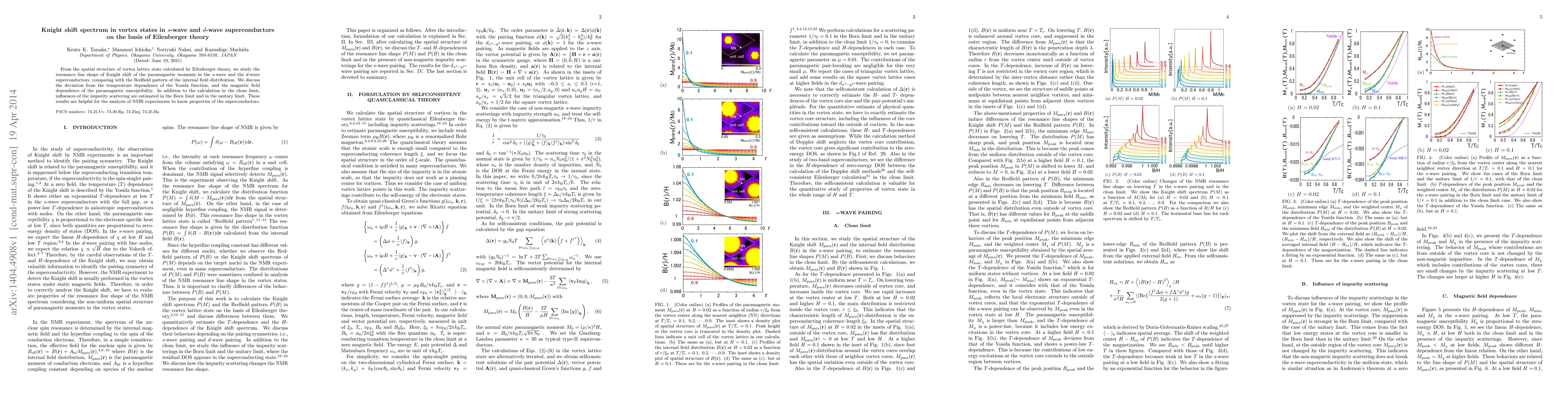 This paper investigates the Knight shift spectrum in vortex states of s-wave and d-wave superconductors using Eilenberger theory, comparing resonance line shapes with Redfield patterns. It also examines the temperature and magnetic field dependencies of paramagnetic susceptibility, considering impurity scattering effects, and provides insights for NMR experiment analyses.
