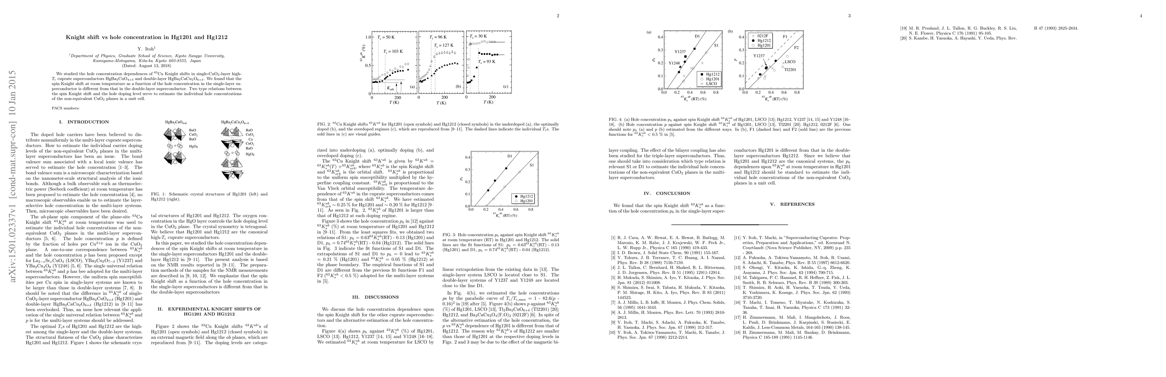 We studied the hole concentration dependences of 63Cu Knight shifts in single-CuO2-layer high-Tc cuprate superconductors HgBa2CuO4+d and double-layer HgBa2CaCu2O6+d. We found that the spin Knight shift at room temperature as a function of the hole concentration in the single-layer superconductor is different from that in the double-layer superconductor. Two type relations between the spin Knight shift and the hole doping level serve to estimate the individual hole concentrations of the non-equivalent CuO2 planes in a unit cell.