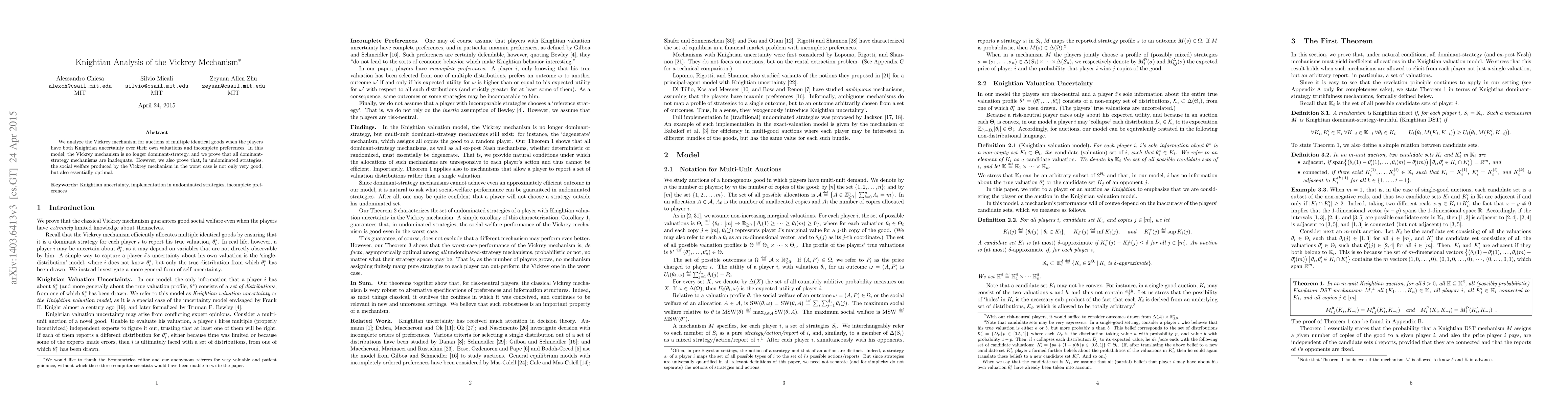 We analyze the Vickrey mechanism for auctions of multiple identical goods when the players have both Knightian uncertainty over their own valuations and incomplete preferences. In this model, the Vickrey mechanism is no longer dominant-strategy, and we prove that all dominant-strategy mechanisms are inadequate. However, we also prove that, in undominated strategies, the social welfare produced by the Vickrey mechanism in the worst case is not only very good, but also essentially optimal.