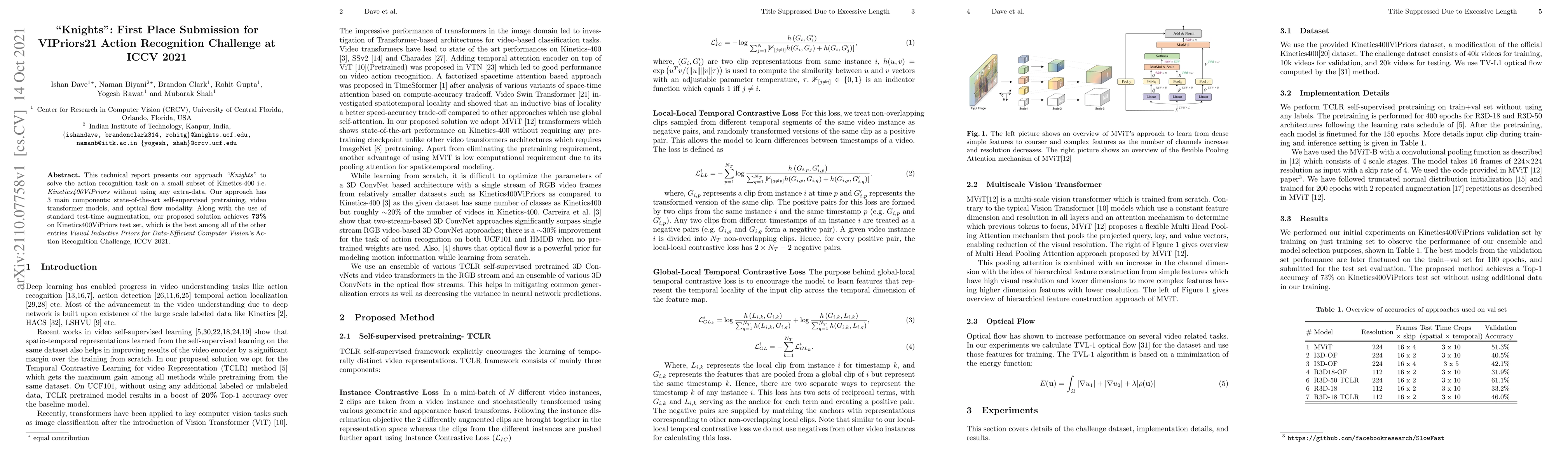 This technical report presents our approach "Knights" to solve the action recognition task on a small subset of Kinetics-400 i.e. Kinetics400ViPriors without using any extra-data. Our approach has 3 main components: state-of-the-art Temporal Contrastive self-supervised pretraining, video transformer models, and optical flow modality. Along with the use of standard test-time augmentation, our proposed solution achieves 73% on Kinetics400ViPriors test set, which is the best among all of the other entries Visual Inductive Priors for Data-Efficient Computer Vision's Action Recognition Challenge, ICCV 2021.
