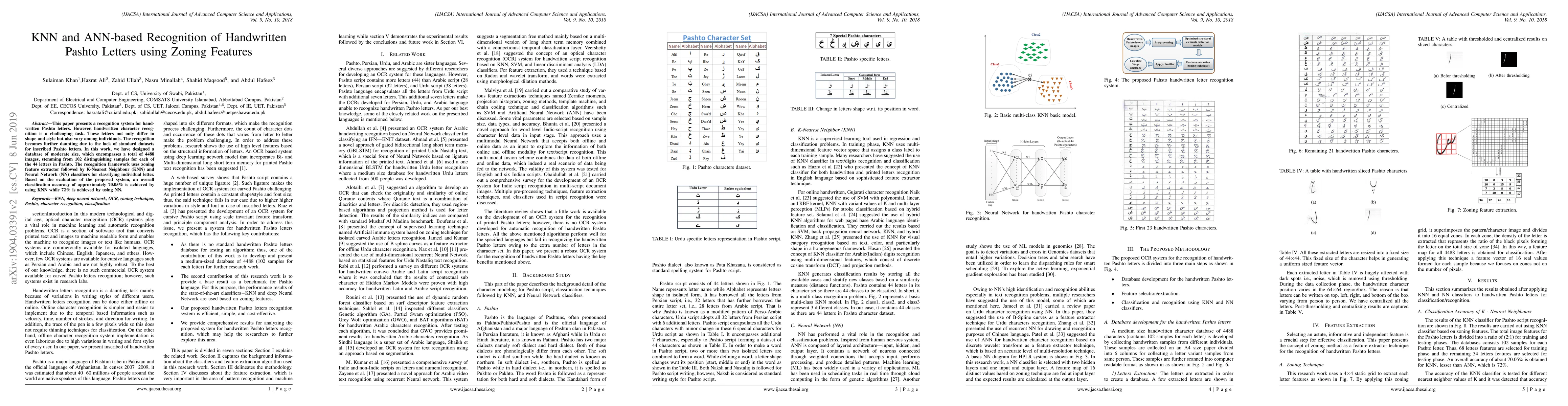 This paper develops a recognition system for handwritten Pashto letters using zoning features, KNN, and ANN classifiers, achieving 70.05% accuracy with KNN and 72% with ANN. The study addresses the challenge of a lack of standard datasets by creating a database of 4488 images.
