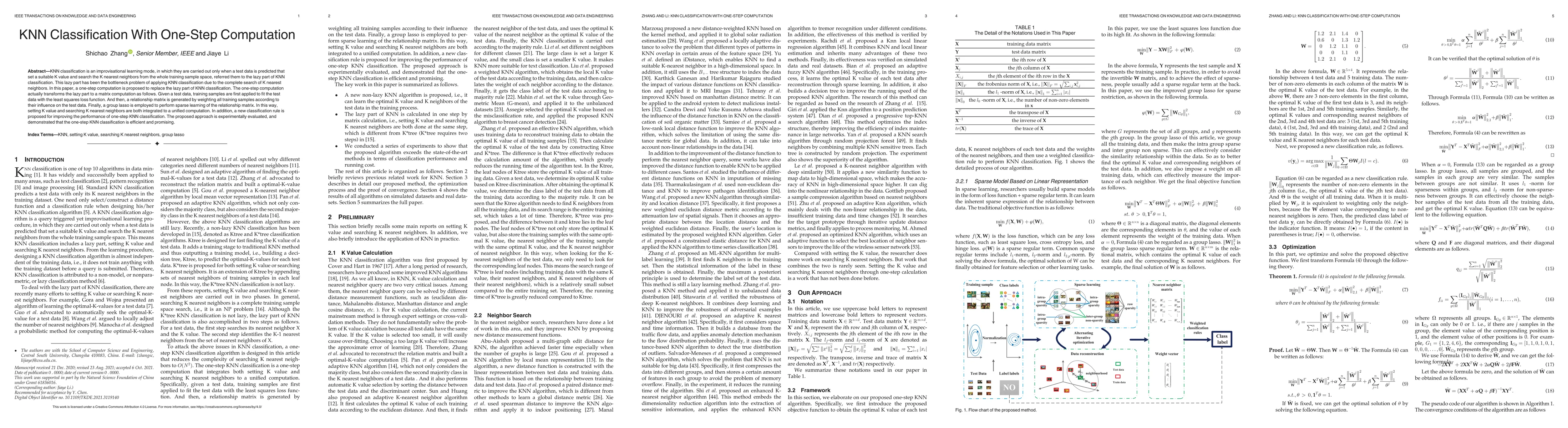 This paper proposes a one-step computation method to replace the traditional lazy KNN classification, which involves searching for the K nearest neighbors. The new method integrates K value setting and neighbor search into a unified matrix computation, employing least squares fitting, a relationship matrix, and group lasso for sparse learning, demonstrating improved efficiency and performance.
