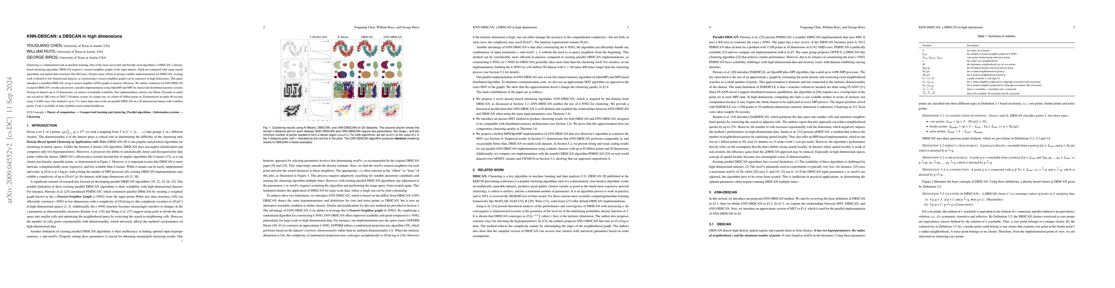 This paper proposes KNN-DBSCAN, a modified version of DBSCAN that uses $\kappa$-nearest neighbor graphs for high-dimensional clustering, enabling efficient clustering of large datasets. The method leverages approximate algorithms with lower memory overhead compared to traditional $\epsilon$-nearest neighbor graphs, and includes parallel implementations for scalability.