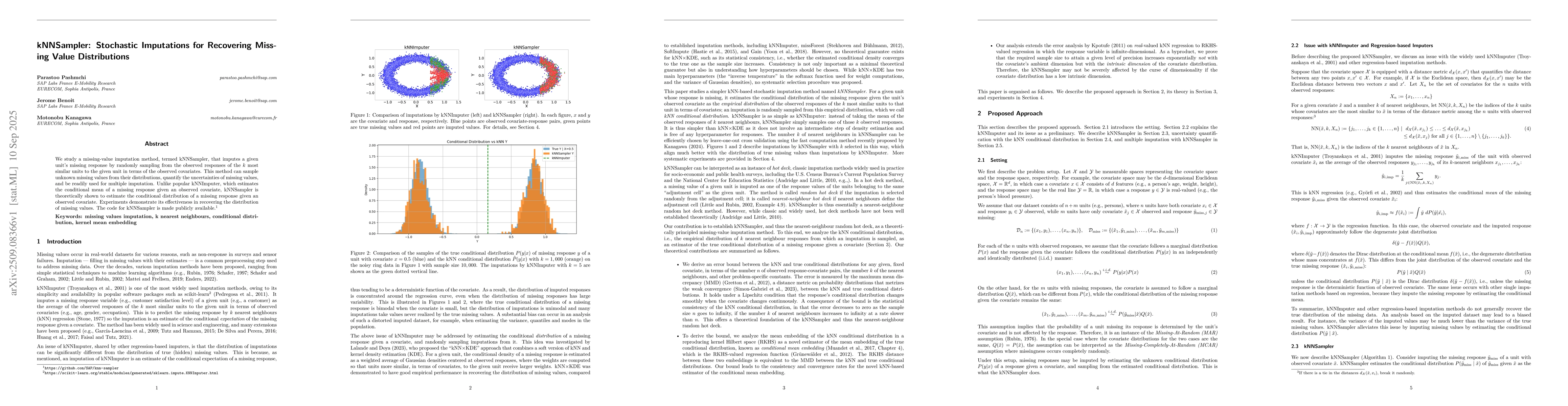 We study a missing-value imputation method, termed kNNSampler, that imputes a given unit's missing response by randomly sampling from the observed responses of the $k$ most similar units to the given unit in terms of the observed covariates. This method can sample unknown missing values from their distributions, quantify the uncertainties of missing values, and be readily used for multiple imputation. Unlike popular kNNImputer, which estimates the conditional mean of a missing response given an observed covariate, kNNSampler is theoretically shown to estimate the conditional distribution of a missing response given an observed covariate. Experiments demonstrate its effectiveness in recovering the distribution of missing values. The code for kNNSampler is made publicly available (https://github.com/SAP/knn-sampler).