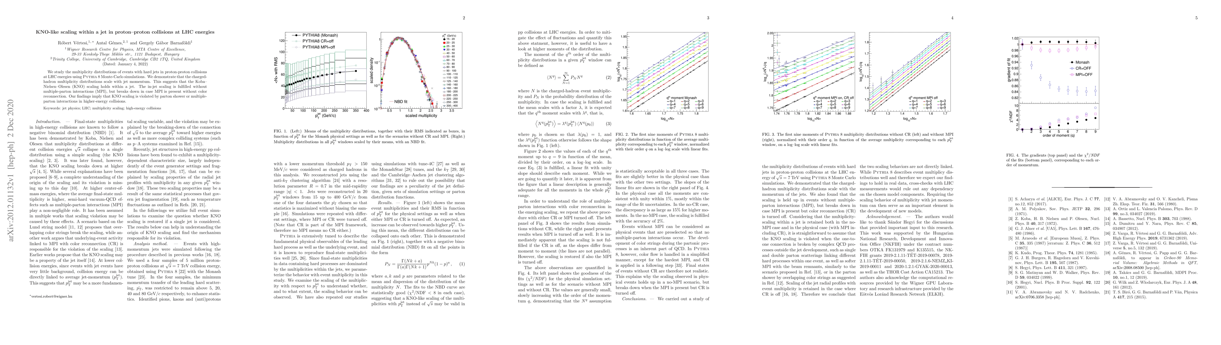This study reveals that charged-hadron multiplicity distributions in proton-proton collisions at LHC energies scale with jet momentum, indicating KNO scaling within jets. However, the scaling breaks down with multiple-parton interactions without color reconnection, suggesting that KNO scaling is violated by parton showers or MPI in high-energy collisions.