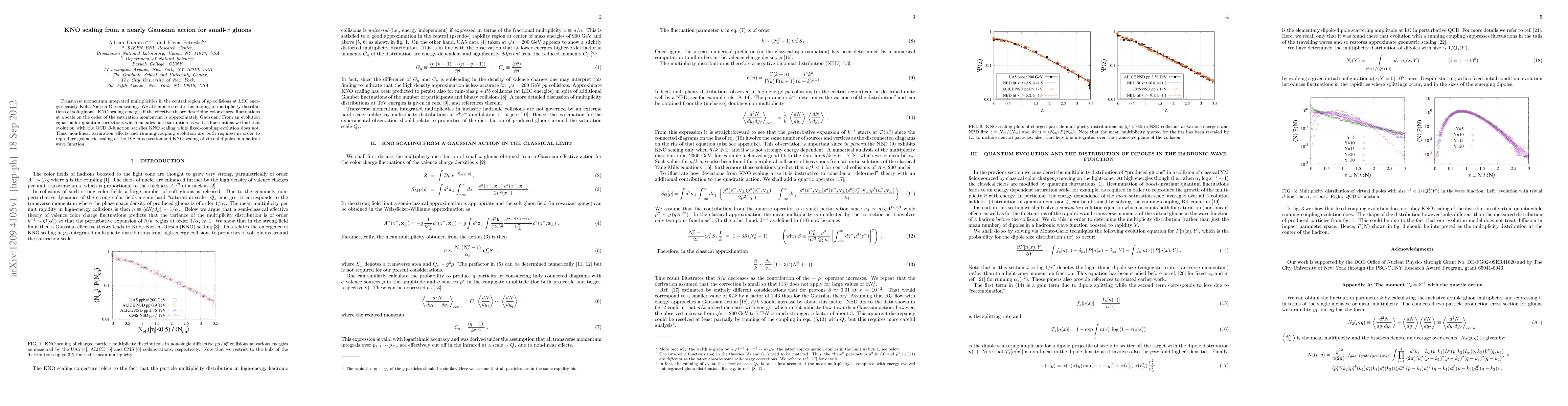 The paper explores Koba-Nielsen-Olesen (KNO) scaling in small-x gluon multiplicities from LHC pp collisions, suggesting a Gaussian effective theory for charge fluctuations near saturation momentum. It finds that KNO scaling arises from QCD beta-function evolution, not fixed-coupling, necessitating non-linear saturation and running-coupling effects to explain geometric scaling in DIS cross sections and KNO scaling in hadron wave functions.