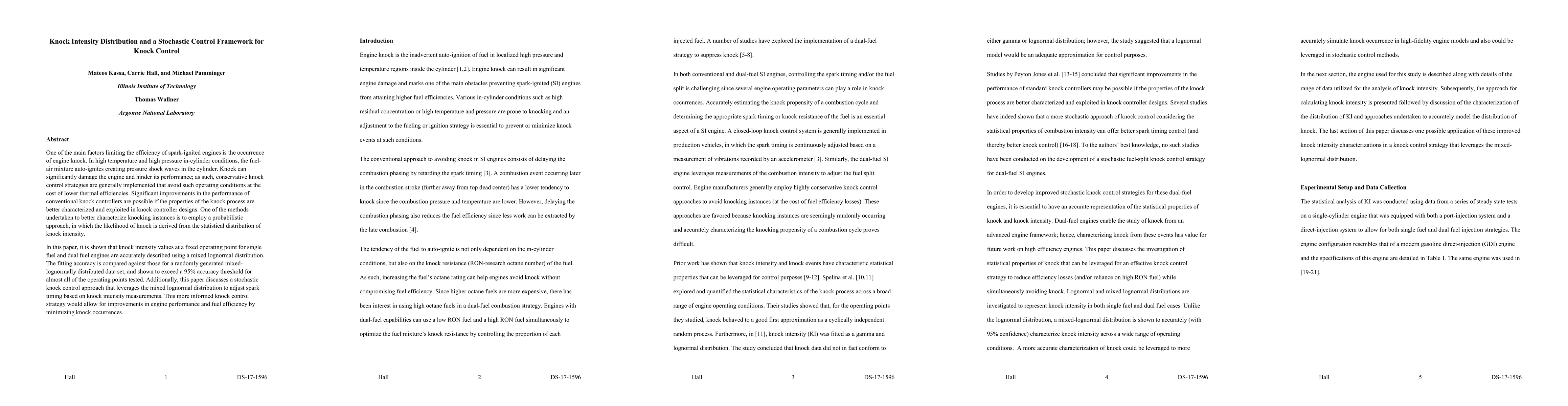 This paper characterizes engine knock using a mixed lognormal distribution for knock intensity, demonstrating high fitting accuracy. It proposes a stochastic control framework that adjusts spark timing based on knock intensity to improve engine performance and fuel efficiency by minimizing knock occurrences.