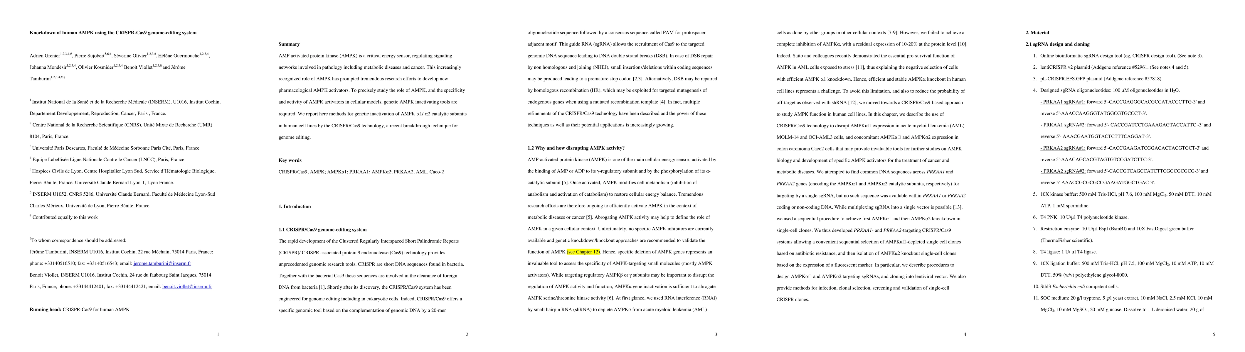 AMP activated protein kinase (AMPK) is a critical energy sensor, regulating signaling networks involved in pathology including metabolic diseases and cancer. This increasingly recognized role of AMPK has prompted tremendous research efforts to develop new pharmacological AMPK activators. To precisely study the role of AMPK, and the specificity and activity of AMPK activators in cellular models, genetic AMPK inactivating tools are required. We report here methods for genetic inactivation of AMPK $\alpha1/ \alpha2$ catalytic subunits in human cell lines by the CRISPR/Cas9 technology, a recent breakthrough technique for genome editing.