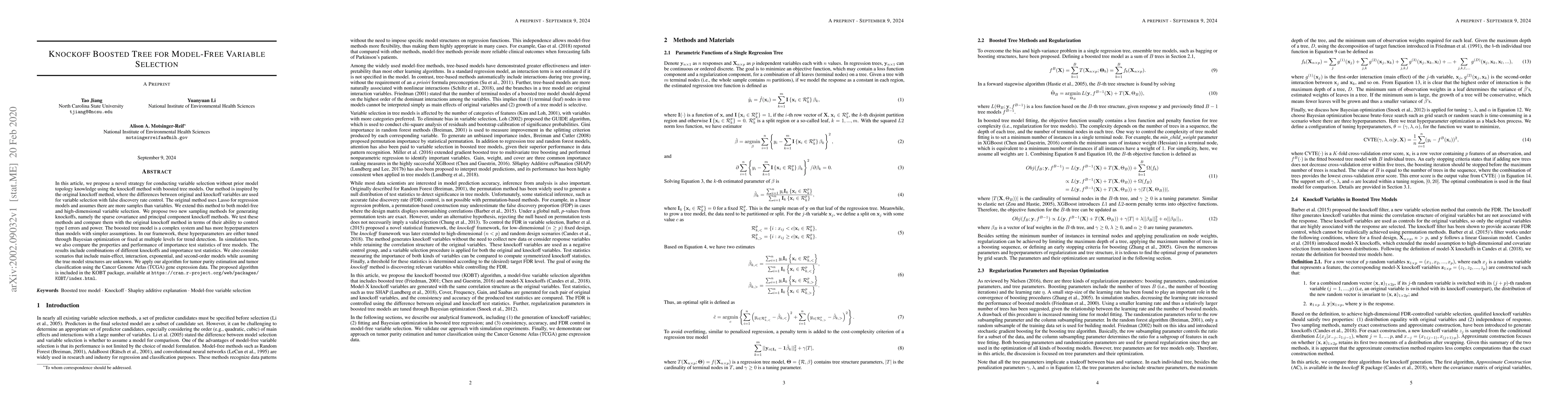 The paper proposes a novel model-free variable selection method called Knockoff Boosted Tree (KOBT), extending the knockoff method to boosted tree models without prior model topology knowledge. Two new sampling methods for generating knockoffs are introduced: sparse covariance and principal component knockoff methods. The method is evaluated through simulation tests and real-world applications like tumor purity estimation and tumor classification using TCGA gene expression data.