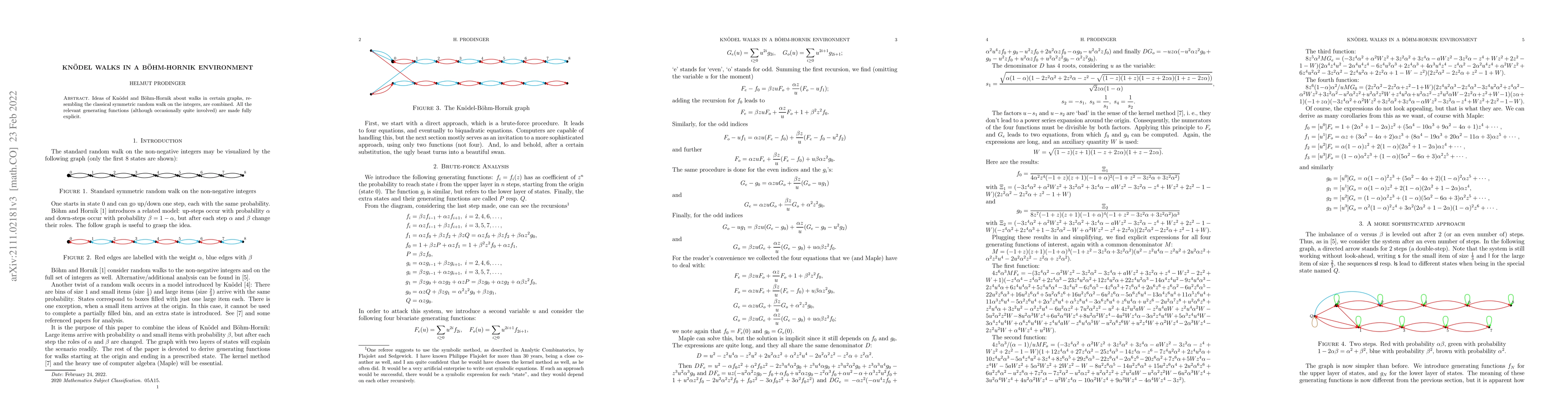 Ideas of Kn\"odel and B\"ohm-Hornik about walks in certain graphs, resembling the classical symmetric random walk on the integers, are combined. All the relevant generating functions (although occasionally quite involved) are made fully explicit.