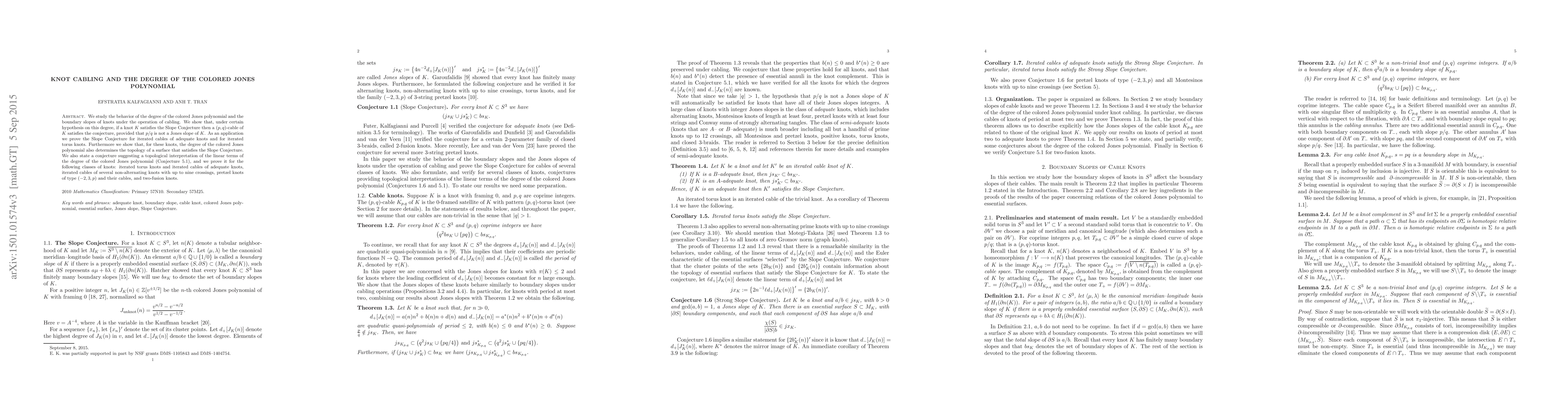 We study the behavior of the degree of the colored Jones polynomial and the boundary slopes of knots under the operation of cabling. We show that, under certain hypothesis on this degree, if a knot $K$ satisfies the Slope Conjecture then a $(p, q)$-cable of $K$ satisfies the conjecture, provided that $p/q$ is not a Jones slope of $K$. As an application we prove the Slope Conjecture for iterated cables of adequate knots and for iterated torus knots. Furthermore we show that, for these knots, the degree of the colored Jones polynomial also determines the topology of a surface that satisfies the Slope Conjecture. We also state a conjecture suggesting a topological interpretation of the linear terms of the degree of the colored Jones polynomial (Conjecture \ref{conj}), and we prove it for the following classes of knots:iterated torus knots and iterated cables of adequate knots, iterated cables of several non-alternating knots with up to nine crossings, pretzel knots of type $(-2, 3, p)$ and their cables, and two-fusion knots.