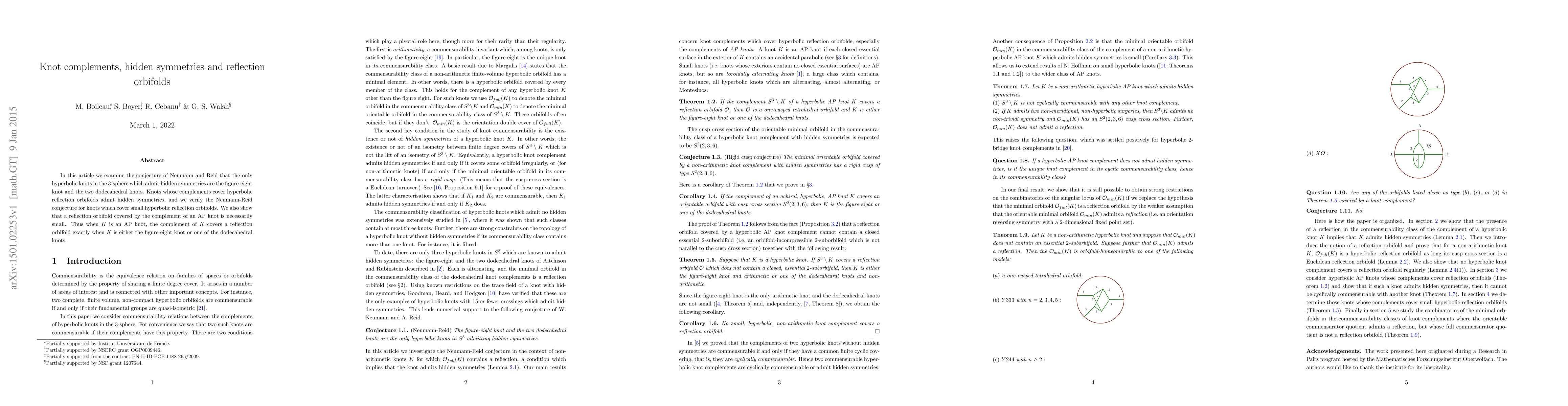 This paper verifies Neumann and Reid's conjecture on hidden symmetries in hyperbolic knots, confirming that only the figure-eight knot and two dodecahedral knots exhibit these symmetries. It shows that AP knots cover small hyperbolic reflection orbifolds, implying that their complements cover reflection orbifolds only if they are the figure-eight or dodecahedral knots.
