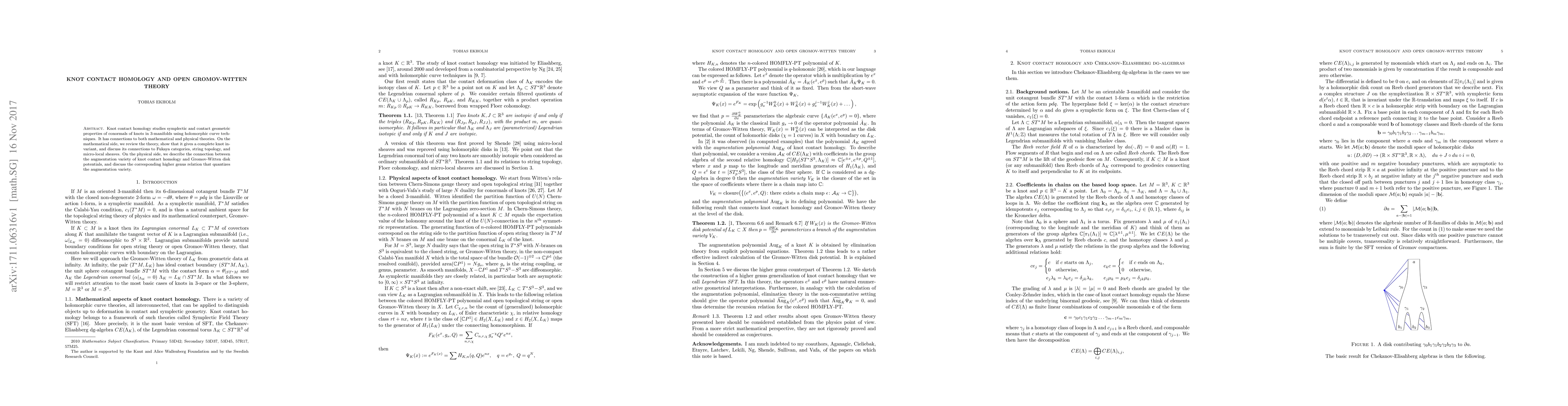 Knot contact homology studies symplectic and contact geometric properties of conormals of knots in 3-manifolds using holomorphic curve techniques. It has connections to both mathematical and physical theories. On the mathematical side, we review the theory, show that it gives a complete knot invariant, and discuss its connections to Fukaya categories, string topology, and micro-local sheaves. On the physical side, we describe the connection between the augmentation variety of knot contact homology and Gromov-Witten disk potentials, and discuss the corresponding higher genus relation that quantizes the augmentation variety.
