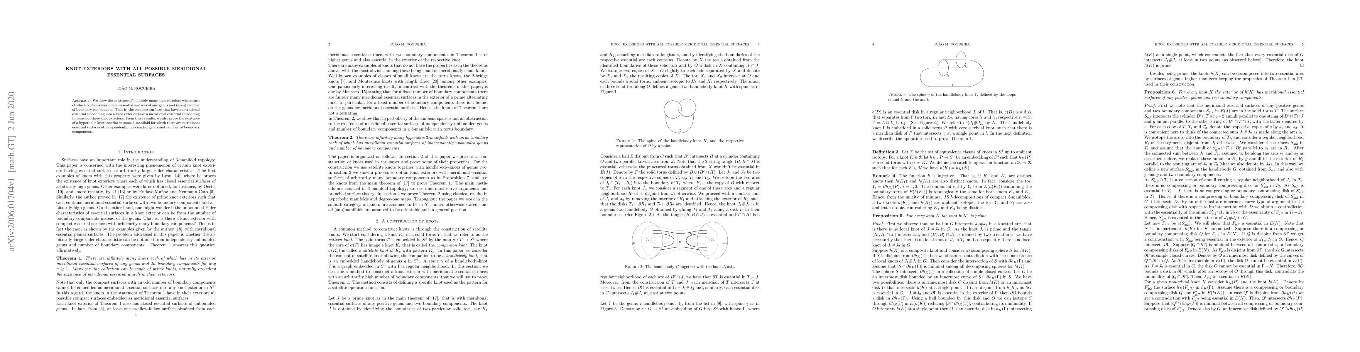 This paper demonstrates the existence of infinitely many hyperbolic knot exteriors, each containing meridional essential surfaces of any genus and even number of boundary components. It also proves the existence of a hyperbolic knot exterior in a 3-manifold with meridional essential surfaces of independently unbounded genus and boundary components.