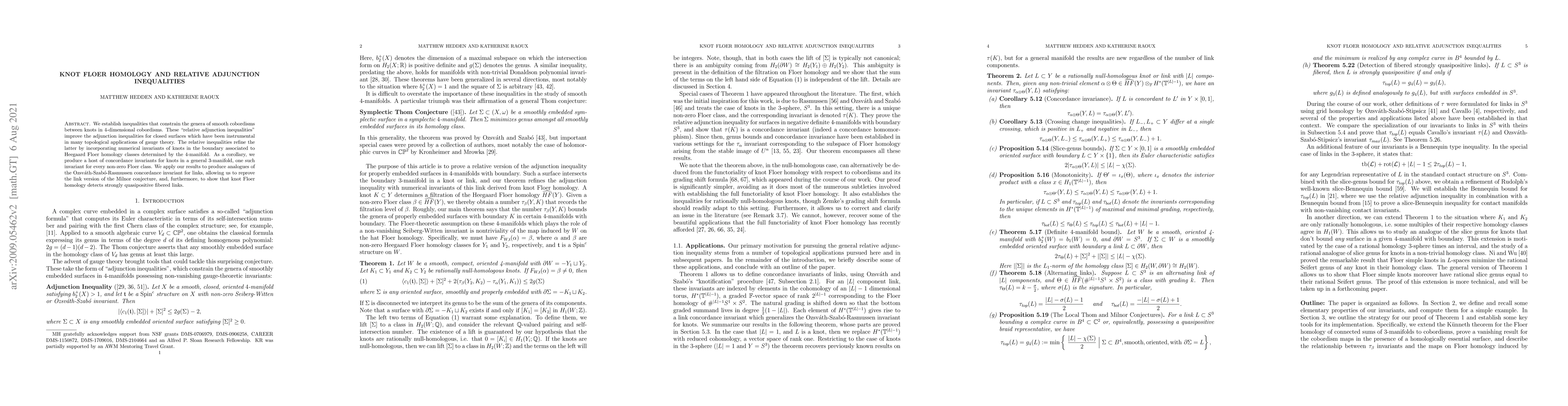 This paper establishes relative adjunction inequalities that refine existing adjunction inequalities for closed surfaces, incorporating knot Floer homology to constrain the genera of cobordisms between knots. These advancements lead to new concordance invariants for knots and confirm the link version of the Milnor conjecture, while also demonstrating that knot Floer homology identifies strongly quasipositive fibered links.