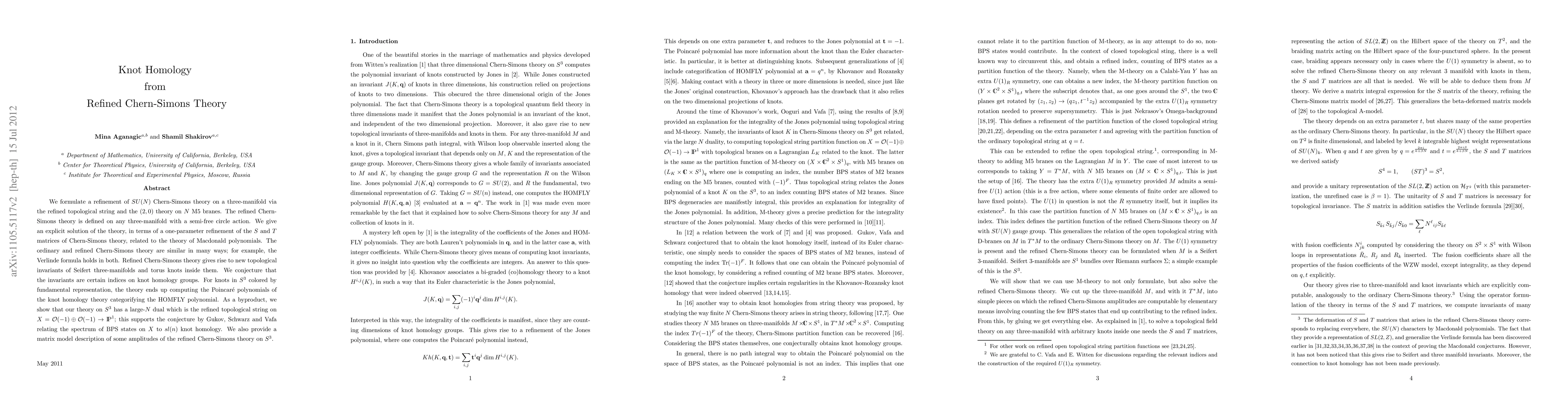 We formulate a refinement of SU(N) Chern-Simons theory on a three-manifold via the refined topological string and the (2,0) theory on N M5 branes. The refined Chern-Simons theory is defined on any three-manifold with a semi-free circle action. We give an explicit solution of the theory, in terms of a one-parameter refinement of the S and T matrices of Chern-Simons theory, related to the theory of Macdonald polynomials. The ordinary and refined Chern-Simons theory are similar in many ways; for example, the Verlinde formula holds in both. We obtain new topological invariants of Seifert three-manifolds and torus knots inside them. We conjecture that the knot invariants we compute are the Poincare polynomials of the sl(n) knot homology theory. The latter includes the Khovanov-Rozansky knot homology, as a special case. The conjecture passes a number of nontrivial checks. We show that, for a large number of torus knots colored with the fundamental representation of SU(N), our knot invariants agree with the Poincare polynomials of Khovanov-Rozansky homology. As a byproduct, we show that our theory on S^3 has a large-N dual which is the refined topological string on X=O(-1)+O(-1)->P^1; this supports the conjecture by Gukov, Schwarz and Vafa relating the spectrum of BPS states on X to sl(n) knot homology. We also provide a matrix model description of some amplitudes of the refined Chern-Simons theory on S^3.