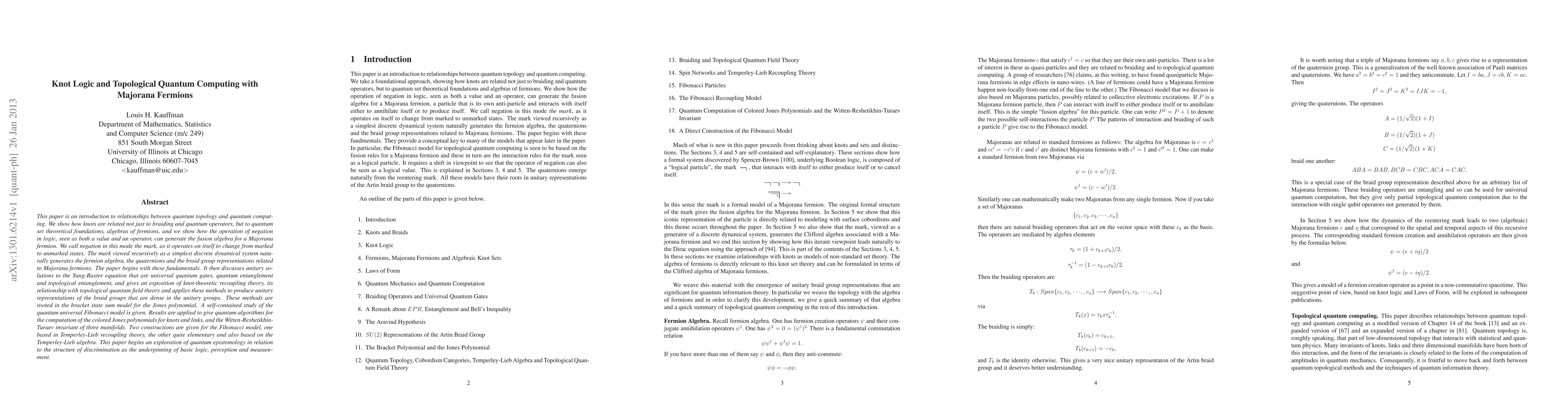 This paper is an introduction to relationships between quantum topology and quantum computing. We take a foundational approach, showing how knots are related not just to braiding and quantum operators, but to quantum set theoretical foundations and algebras of fermions. We show how the operation of negation in logic, seen as both a value and an operator, can generate the fusion algebra for a Majorana fermion, a particle that is its own anti-particle and interacts with itself either to annihilate itself or to produce itself. We call negation in this mode the mark, as it operates on itself to change from marked to unmarked states. The mark viewed recursively as a simplest discrete dynamical system naturally generates the fermion algebra, the quaternions and the braid group representations related to Majorana fermions. The paper begins with these fundmentals. They provide a conceptual key to many of the models that appear later in the paper. In particular, the Fibonacci model for topological quantum computing is seen to be based on the fusion rules for a Majorana fermion and these in turn are the interaction rules for the mark seen as a logical particle. It requires a shift in viewpoint to see that the operator of negation can also be seen as a logical value. The quaternions emerge naturally from the reentering mark. All these models have their roots in unitary representations of the Artin braid group to the quaternions.