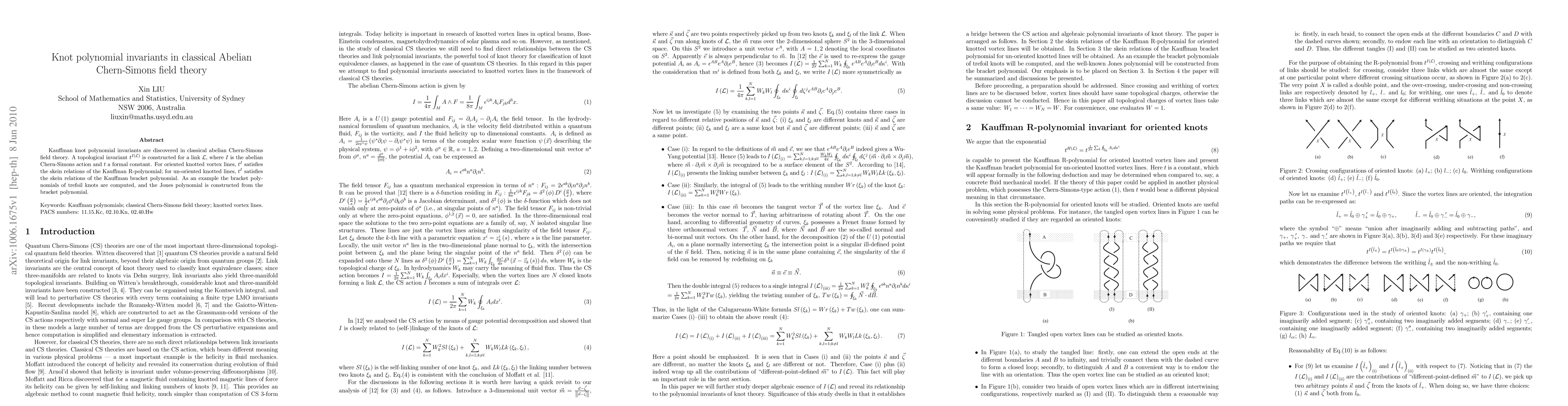 This paper discovers Kauffman knot polynomial invariants in classical abelian Chern-Simons field theory, constructing a topological invariant $t^{I\left( \mathcal{L} \right)}$ for links. The invariant satisfies the skein relations of the Kauffman R-polynomial for oriented knotted vortex lines and the Kauffman bracket polynomial for un-oriented lines, with examples including trefoil knot computations and a construction of the Jones polynomial.
