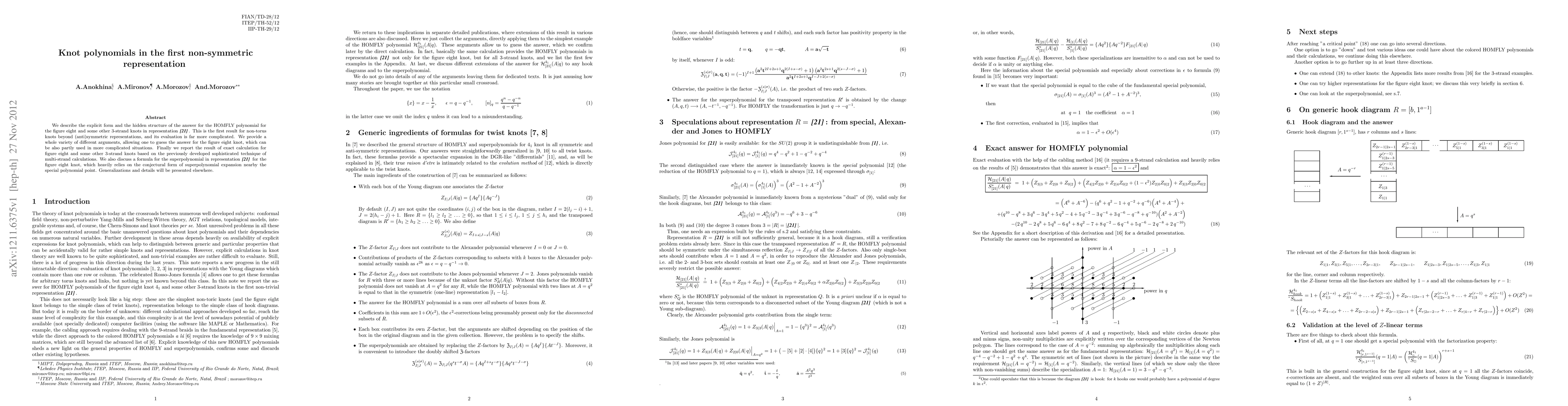 We describe the explicit form and the hidden structure of the answer for the HOMFLY polynomial for the figure eight and some other 3-strand knots in representation [21]. This is the first result for non-torus knots beyond (anti)symmetric representations, and its evaluation is far more complicated. We provide a whole variety of different arguments, allowing one to guess the answer for the figure eight knot, which can be also partly used in more complicated situations. Finally we report the result of exact calculation for figure eight and some other 3-strand knots based on the previously developed sophisticated technique of multi-strand calculations. We also discuss a formula for the superpolynomial in representation [21] for the figure eight knot, which heavily relies on the conjectural form of superpolynomial expansion nearby the special polynomial point. Generalizations and details will be presented elsewhere.