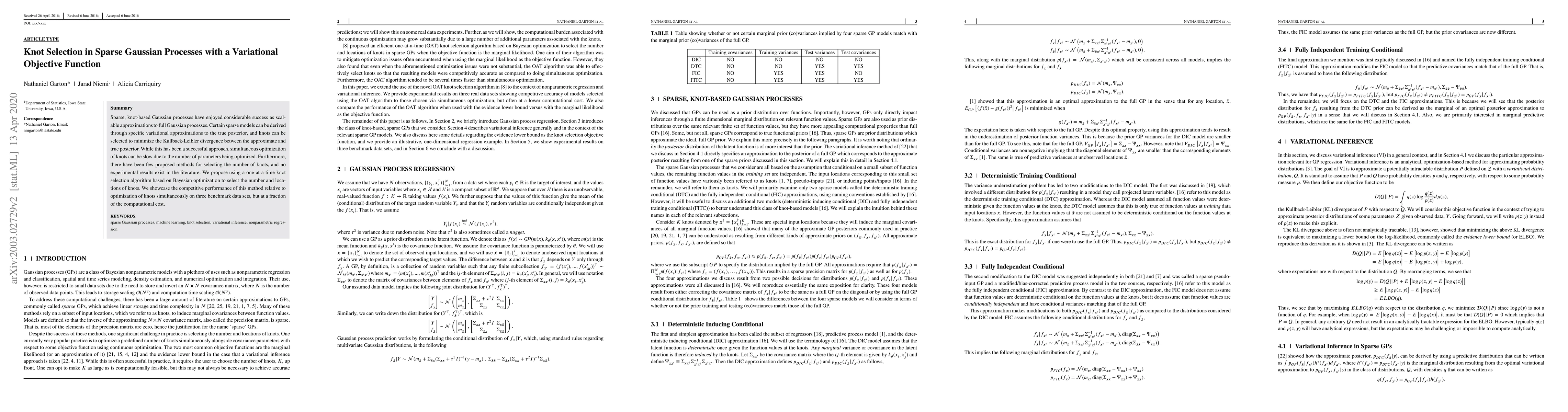 This paper proposes a one-at-a-time Bayesian optimization algorithm for selecting the number and locations of knots in sparse Gaussian processes to minimize the Kullback-Leibler divergence. The method demonstrates competitive performance and significantly lower computational costs compared to simultaneous optimization approaches.
