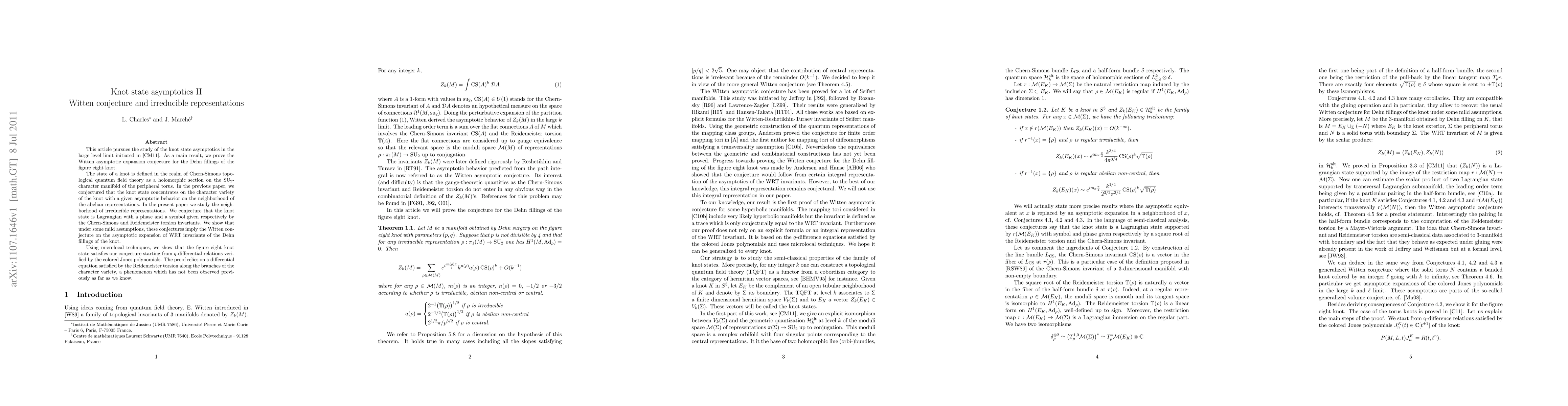 This article pursues the study of the knot state asymptotics in the large level limit initiated in "Knot sate Asymptotics I". As a main result, we prove the Witten asymptotic expansion conjecture for the Dehn fillings of the figure eight knot. The state of a knot is defined in the realm of Chern-Simons topological quantum field theory as a holomorphic section on the SU(2)-character manifold of the peripheral torus. In the previous paper, we conjectured that the knot state concentrates on the character variety of the knot with a given asymptotic behavior on the neighborhood of the abelian representations. In the present paper we study the neighborhood of irreducible representations. We conjecture that the knot state is Lagrangian with a phase and a symbol given respectively by the Chern-Simons and Reidemeister torsion invariants. We show that under some mild assumptions, these conjectures imply the Witten conjecture on the asymptotic expansion of WRT invariants of the Dehn fillings of the knot. Using microlocal techniques, we show that the figure eight knot state satisfies our conjecture starting from q-differential relations verified by the colored Jones polynomials. The proof relies on a differential equation satisfied by the Reidemeister torsion along the branches of the character variety, a phenomenon which has not been observed previously as far as we know.