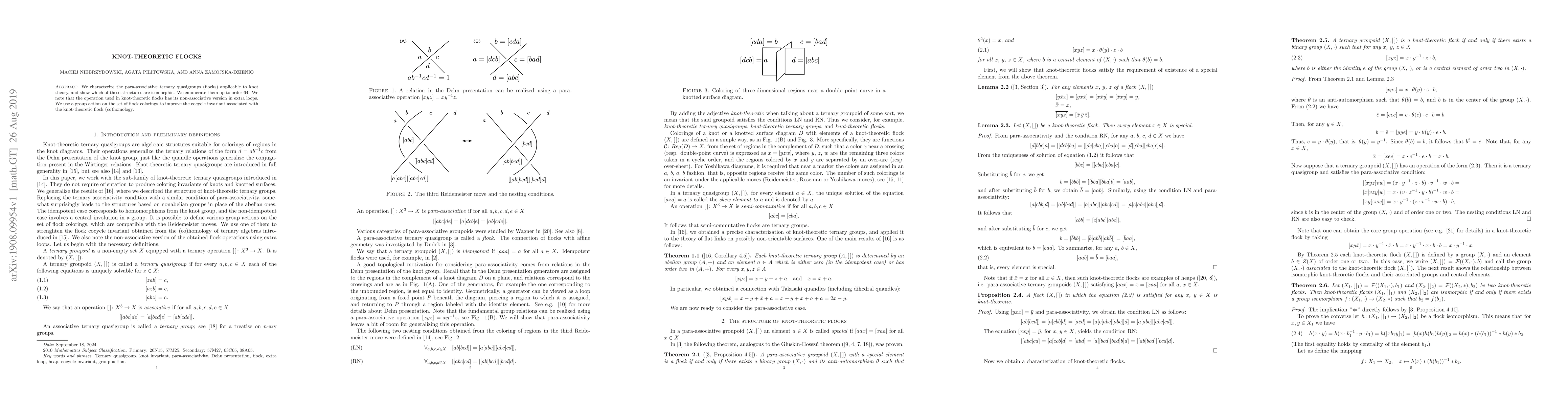 We characterize the para-associative ternary quasigroups (flocks) applicable to knot theory, and show which of these structures are isomorphic. We enumerate them up to order 64. We note that the operation used in knot-theoretic flocks has its non-associative version in extra loops. We use a group action on the set of flock colorings to improve the cocycle invariant associated with the knot-theoretic flock (co)homology.