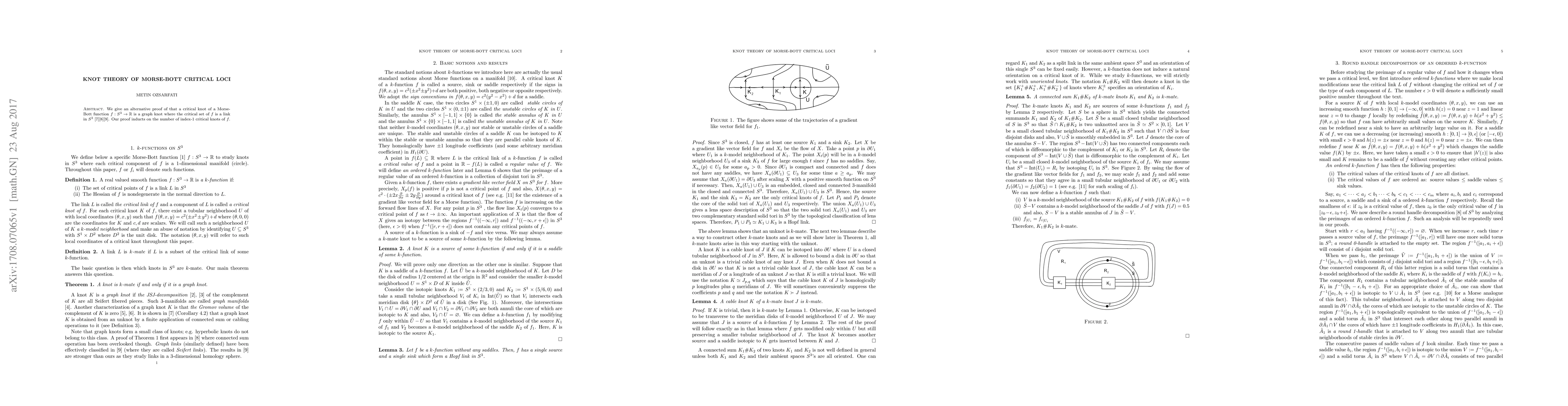 We give an alternative proof of that a critical knot of a Morse-Bott function $f: S^3 \rightarrow \mathbb{R}$ is a graph knot where the critical set of $f$ is a link in $S^3$. Our proof inducts on the number of index-1 critical knots of $f$.