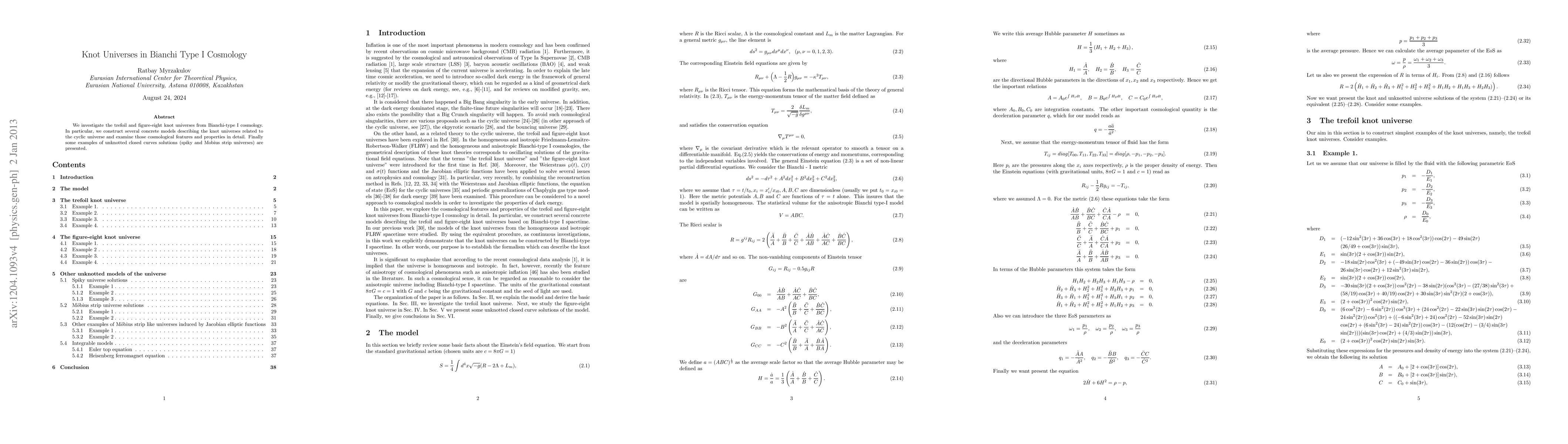 This research examines trefoil and figure-eight knot universes within Bianchi Type I cosmology, constructing models that explore their cyclic universe properties and comparing them to unknotted closed curve solutions like spiky and Mobius strip universes.