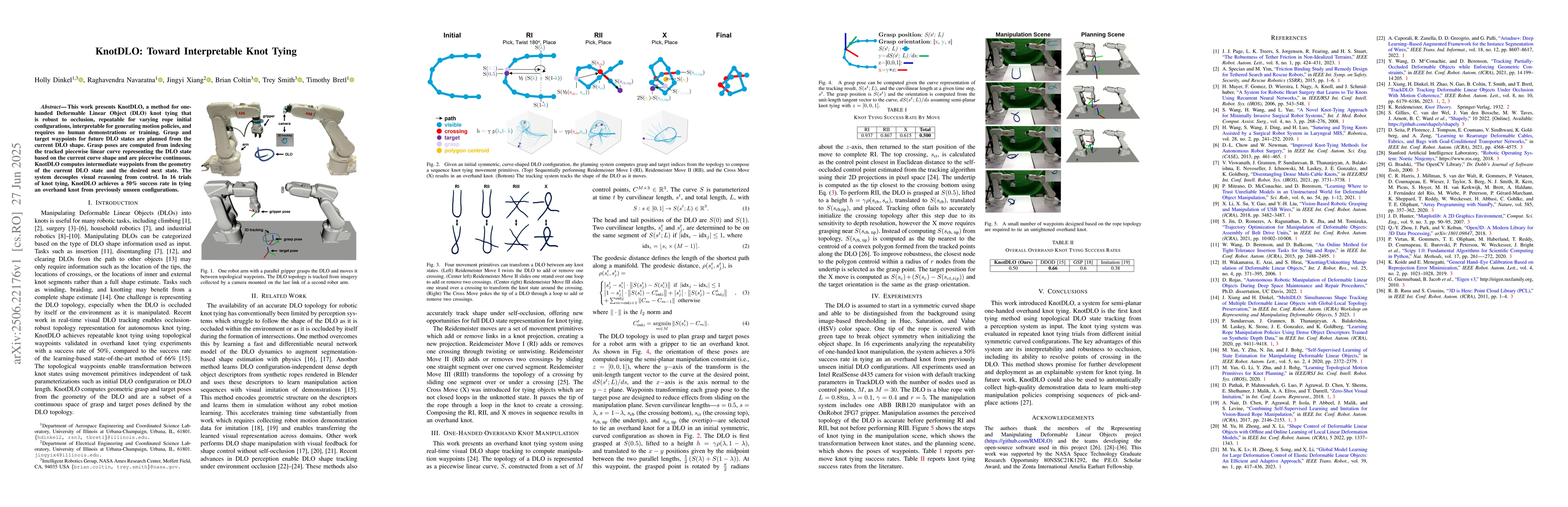 This work presents KnotDLO, a method for one-handed Deformable Linear Object (DLO) knot tying that is robust to occlusion, repeatable for varying rope initial configurations, interpretable for generating motion policies, and requires no human demonstrations or training. Grasp and target waypoints for future DLO states are planned from the current DLO shape. Grasp poses are computed from indexing the tracked piecewise linear curve representing the DLO state based on the current curve shape and are piecewise continuous. KnotDLO computes intermediate waypoints from the geometry of the current DLO state and the desired next state. The system decouples visual reasoning from control. In 16 trials of knot tying, KnotDLO achieves a 50% success rate in tying an overhand knot from previously unseen configurations.