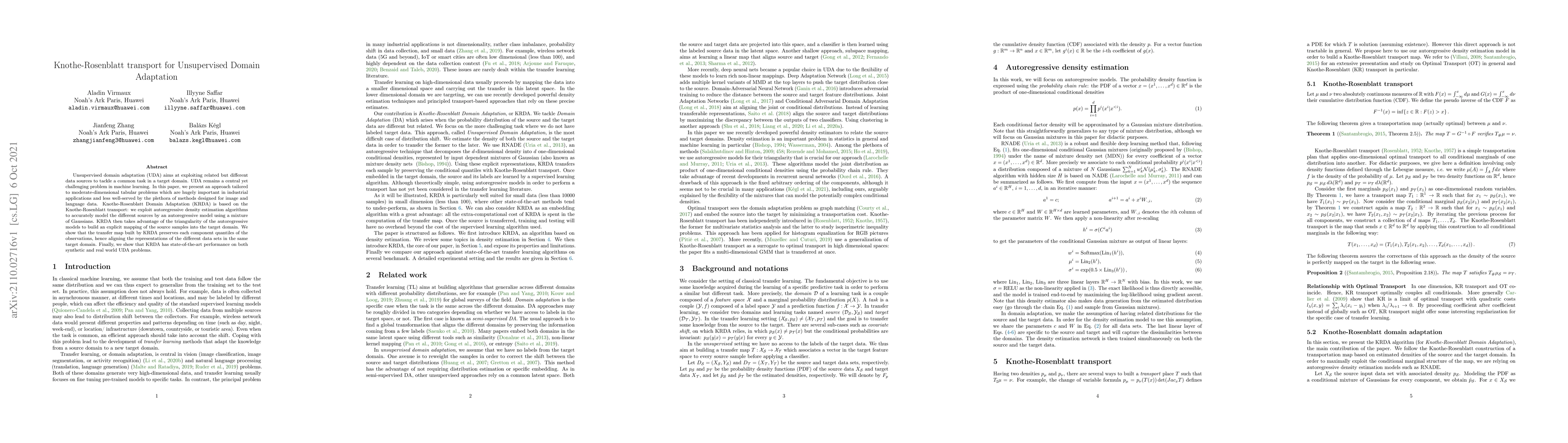 Unsupervised domain adaptation (UDA) aims at exploiting related but different data sources to tackle a common task in a target domain. UDA remains a central yet challenging problem in machine learning. In this paper, we present an approach tailored to moderate-dimensional tabular problems which are hugely important in industrial applications and less well-served by the plethora of methods designed for image and language data. Knothe-Rosenblatt Domain Adaptation (KRDA) is based on the Knothe-Rosenblatt transport: we exploit autoregressive density estimation algorithms to accurately model the different sources by an autoregressive model using a mixture of Gaussians. KRDA then takes advantage of the triangularity of the autoregressive models to build an explicit mapping of the source samples into the target domain. We show that the transfer map built by KRDA preserves each component quantiles of the observations, hence aligning the representations of the different data sets in the same target domain. Finally, we show that KRDA has state-of-the-art performance on both synthetic and real world UDA problems.