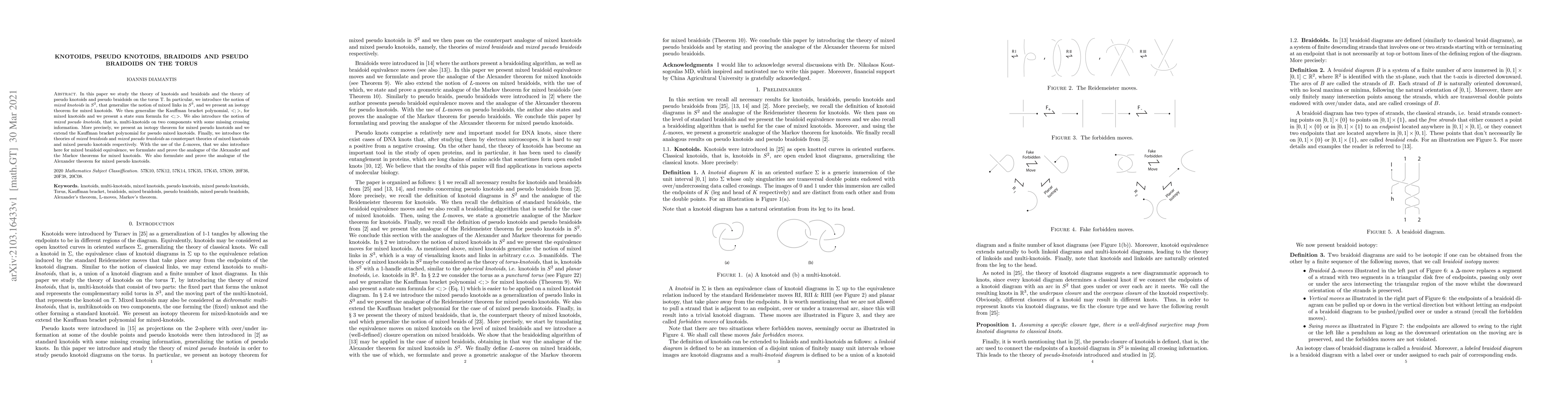 This paper explores the theories of knotoids, pseudo knotoids, braidoids, and pseudo braidoids on the torus, introducing mixed knotoids and proving an isotopy theorem. It extends the Kauffman bracket polynomial for mixed knotoids and pseudo knotoids, and formulates analogues of the Alexander and Markov theorems for these structures.