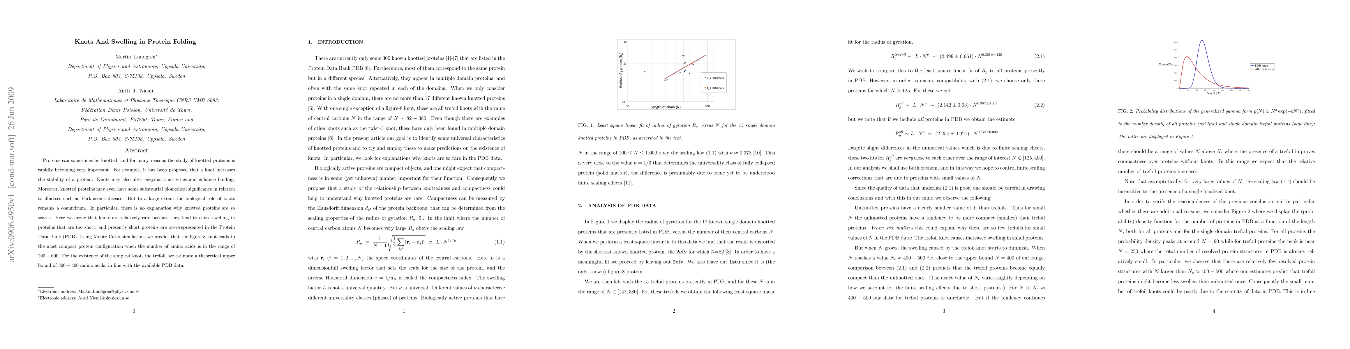 This study suggests that knots in proteins are rare due to their tendency to cause protein swelling, especially in shorter proteins which are over-represented in databases. Monte Carlo simulations predict that figure-8 knots lead to the most compact protein configuration for lengths of 200-600 amino acids, while the simplest knot, trefoil, is theorized to exist in proteins with 300-400 amino acids, aligning with observed data.
