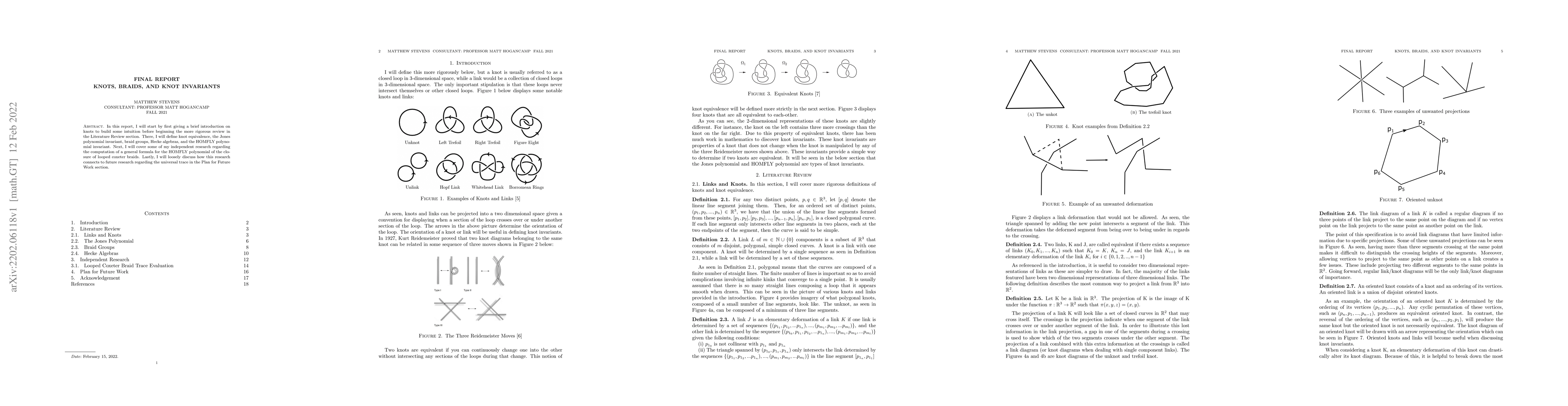In this report, I will start by first giving a brief introduction on knots to build some intuition before beginning the more rigorous review in the Literature Review section. There, I will define knot equivalence, the Jones polynomial invariant, braid groups, Hecke algebras, and the HOMFLY polynomial invariant. Next, I will cover some of my independent research regarding the computation of a general formula for the HOMFLY polynomial of the closure of looped coxeter braids. Lastly, I will loosely discuss how this research connects to future research regarding the universal trace in the Plan for Future Work section.