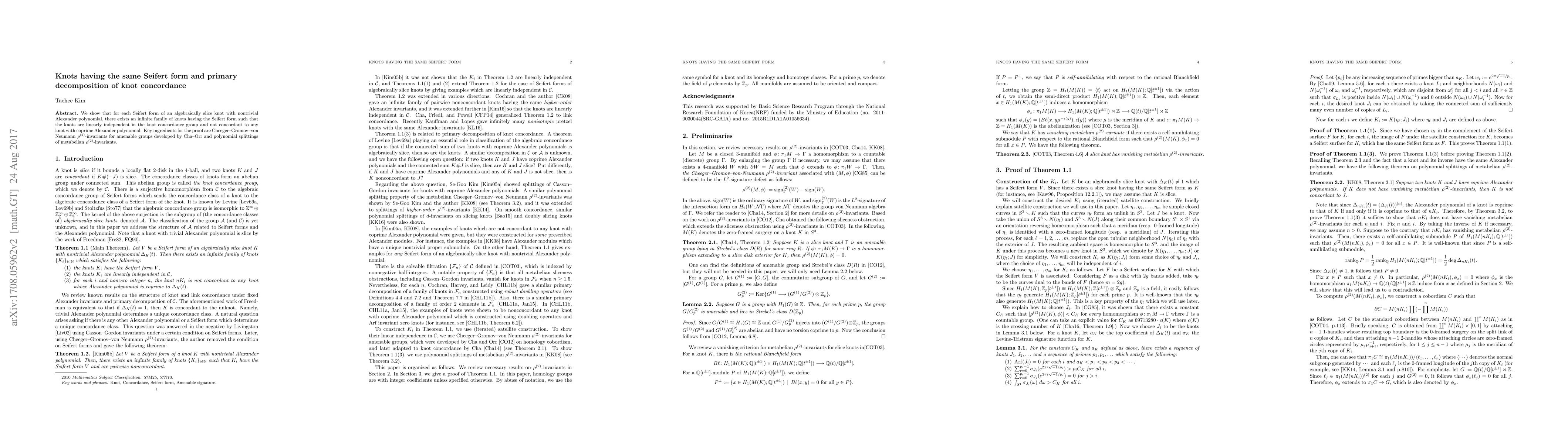 Summary: The paper demonstrates the existence of an infinite family of algebraically slice knots sharing the same Seifert form but differing in knot concordance, proving their linear independence in the knot concordance group and their non-concordance to knots with coprime Alexander polynomials. The proof utilizes advanced invariants and polynomial splittings developed for amenable groups.