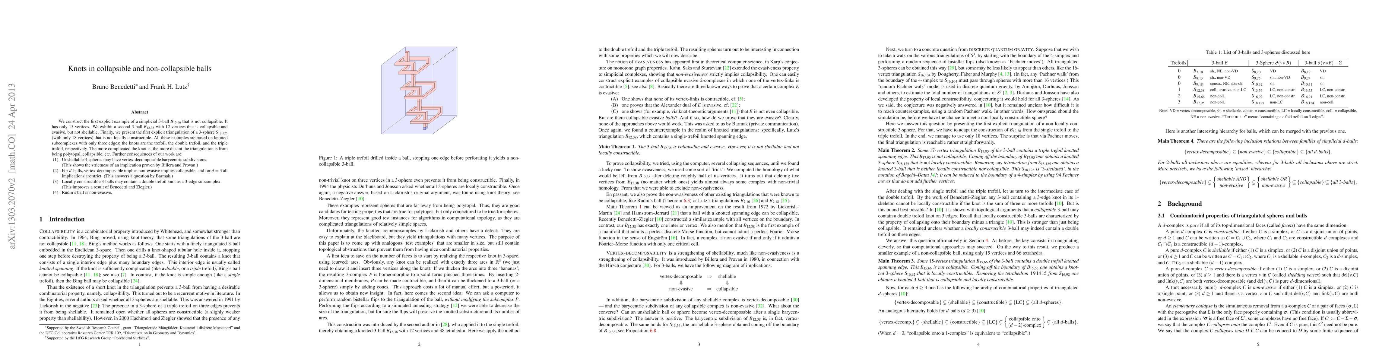 We construct the first explicit example of a simplicial 3-ball B_{15,66} that is not collapsible. It has only 15 vertices. We exhibit a second 3-ball B_{12,38} with 12 vertices that is collapsible and evasive, but not shellable. Finally, we present the first explicit triangulation of a 3-sphere S_{18, 125} (with only 18 vertices) that is not locally constructible. All these examples are based on knotted subcomplexes with only three edges; the knots are the trefoil, the double trefoil, and the triple trefoil, respectively. The more complicated the knot is, the more distant the triangulation is from being polytopal, collapsible, etc. Further consequences of our work are: (1) Unshellable 3-spheres may have vertex-decomposable barycentric subdivisions. (This shows the strictness of an implication proven by Billera and Provan.) (2) For d-balls, vertex-decomposable implies non-evasive implies collapsible, and for d=3 all implications are strict. (This answers a question by Barmak.) (3) Locally constructible 3-balls may contain a double trefoil knot as a 3-edge subcomplex. (This improves a result of Benedetti and Ziegler.) (4) Rudin's ball is non-evasive.