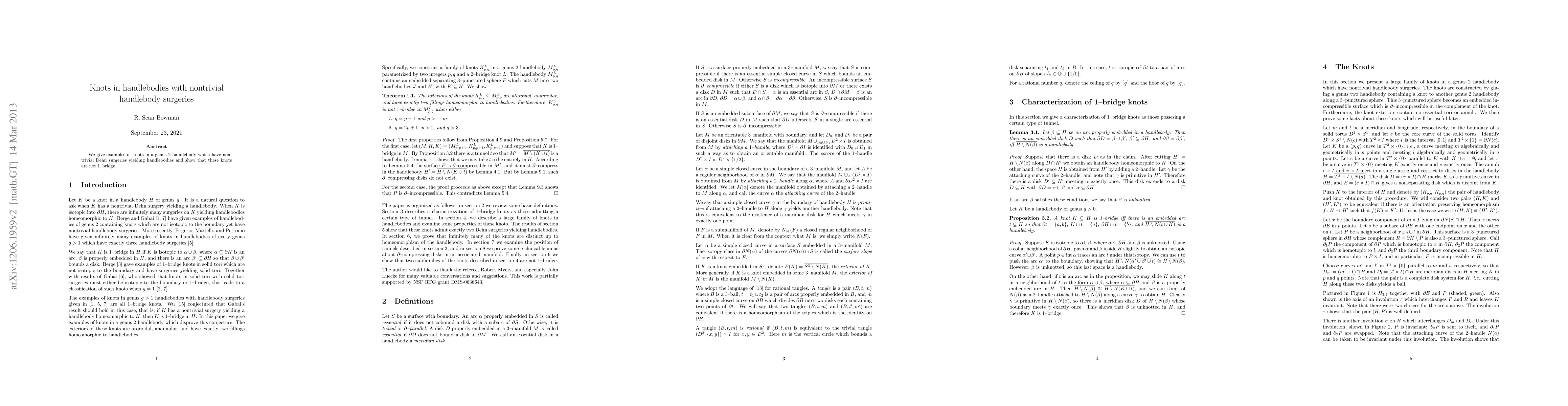 Summary: This paper presents examples of knots within a genus 2 handlebody that undergo nontrivial Dehn surgeries resulting in handlebodies, demonstrating that these knots are not 1-bridge. The study highlights the intricate relationships between knot theory and handlebody surgeries.