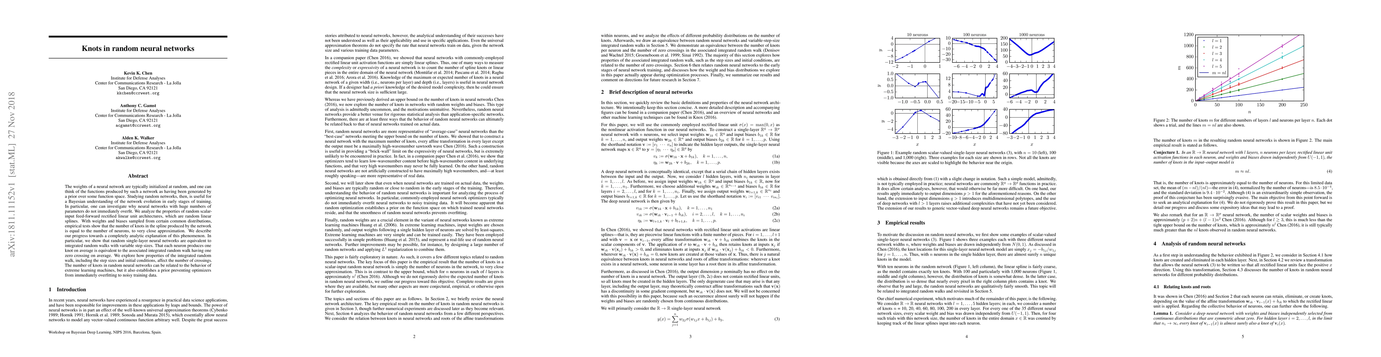 This paper explores the properties of random neural networks, specifically focusing on the number of "knots" in their function representations, which correlates closely with the number of neurons. The authors provide an analytical explanation linking these networks to integrated random walks, suggesting that this structure helps prevent immediate overfitting during early training stages.