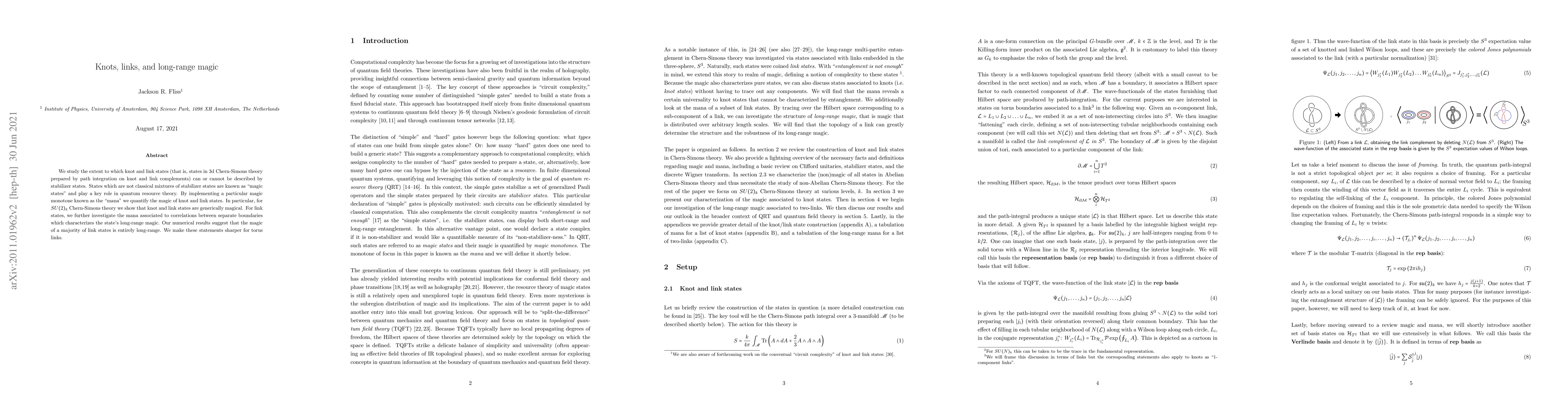 We study the extent to which knot and link states (that is, states in 3d Chern-Simons theory prepared by path integration on knot and link complements) can or cannot be described by stabilizer states. States which are not classical mixtures of stabilizer states are known as "magic states" and play a key role in quantum resource theory. By implementing a particular magic monotone known as the "mana" we quantify the magic of knot and link states. In particular, for $SU(2)_k$ Chern-Simons theory we show that knot and link states are generically magical. For link states, we further investigate the mana associated to correlations between separate boundaries which characterizes the state's long-range magic. Our numerical results suggest that the magic of a majority of link states is entirely long-range. We make these statements sharper for torus links.