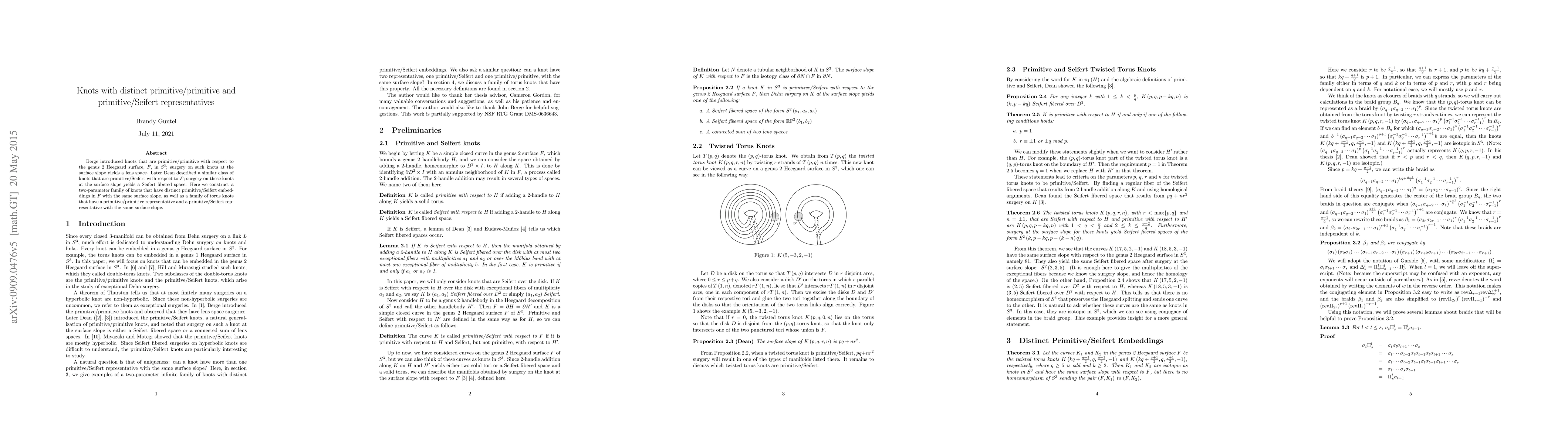 Berge introduced knots that are primitive/primitive with respect to the genus 2 Heegaard surface, $F$, in $S^3$; surgery on such knots at the surface slope yields a lens space. Later Dean described a similar class of knots that are primitive/Seifert with respect to $F$; surgery on these knots at the surface slope yields a Seifert fibered space. Here we construct a two-parameter family of knots that have distinct primitive/Seifert embeddings in $F$ with the same surface slope, as well as a family of torus knots that have a primitive/primitive representative and a primitive/Seifert representative with the same surface slope.