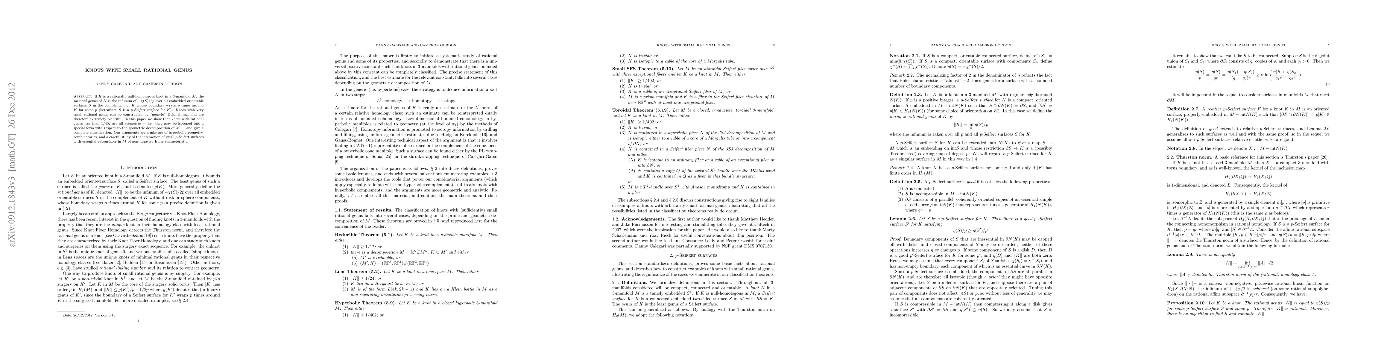 If K is a rationally null-homologous knot in a 3-manifold M, the rational genus of K is the infimum of -\chi(S)/2p over all embedded orientable surfaces S in the complement of K whose boundary wraps p times around K for some p (hereafter: S is a p-Seifert surface for K). Knots with very small rational genus can be constructed by "generic" Dehn filling, and are therefore extremely plentiful. In this paper we show that knots with rational genus less than 1/402 are all geometric -- i.e. they may be isotoped into a special form with respect to the geometric decomposition of M -- and give a complete classification. Our arguments are a mixture of hyperbolic geometry, combinatorics, and a careful study of the interaction of small p-Seifert surfaces with essential subsurfaces in M of non-negative Euler characteristic.