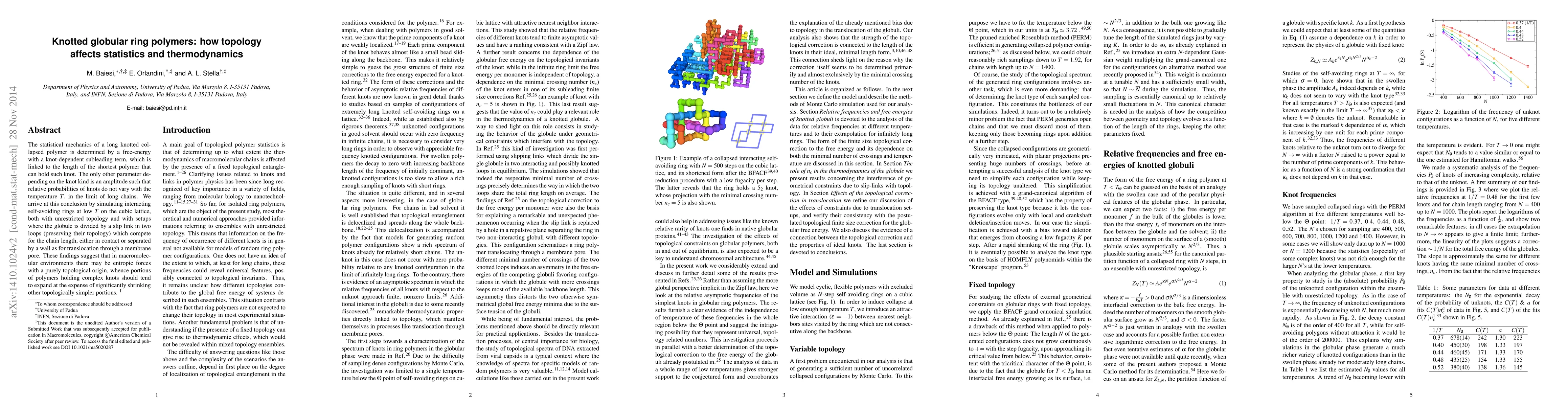 The statistical mechanics of a long knotted collapsed polymer is determined by a free-energy with a knot-dependent subleading term, which is linked to the length of the shortest polymer that can hold such knot. The only other parameter depending on the knot kind is an amplitude such that relative probabilities of knots do not vary with the temperature $T$, in the limit of long chains. We arrive at this conclusion by simulating interacting self-avoiding rings at low $T$ on the cubic lattice, both with unrestricted topology and with setups where the globule is divided by a slip link in two loops (preserving their topology) which compete for the chain length, either in contact or separated by a wall as for translocation through a membrane pore. These findings suggest that in macromolecular environments there may be entropic forces with a purely topological origin, whence portions of polymers holding complex knots should tend to expand at the expense of significantly shrinking other topologically simpler portions.