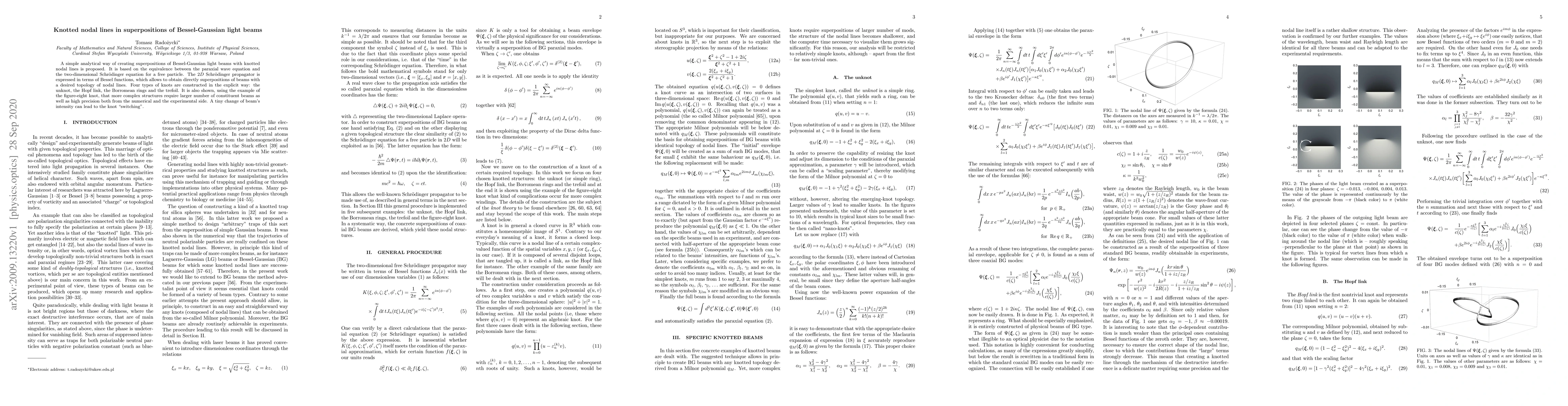 This paper proposes a method to create superpositions of Bessel-Gaussian light beams with knotted nodal lines, utilizing the equivalence between the paraxial wave equation and the 2D Schrödinger equation. Four types of knots—unknot, Hopf link, Borromean rings, and trefoil—are explicitly constructed, highlighting the need for high precision in creating more complex knots.