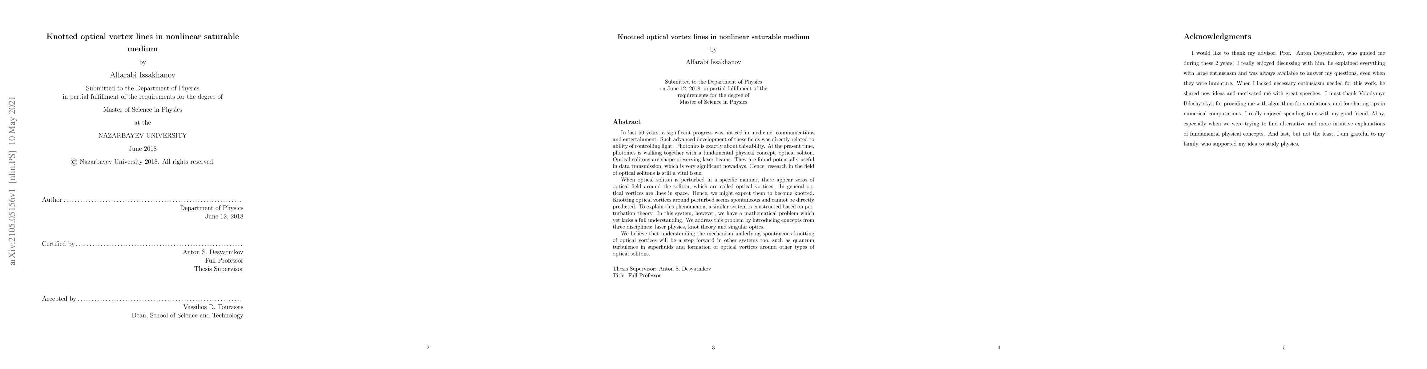 In last 50 years, a significant progress was noticed in medicine, communications and entertainment. Such advanced development of these fields was directly related to ability of controlling light. Photonics is exactly about this ability. At the present time, photonics is walking together with a fundamental physical concept, optical soliton. Optical solitons are shape-preserving laser beams. They are found potentially useful in data transmission, which is very significant nowadays. Hence, research in the field of optical solitons is still a vital issue. When optical soliton is perturbed in a specific manner, there appear zeros of optical field around the soliton, which are called optical vortices. In general optical vortices are lines in space. Hence, we might expect them to become knotted. Knotting optical vortices around perturbed seems spontaneous and cannot be directly predicted. To explain this phenomenon, a similar system is constructed based on perturbation theory. In this system, however, we have a mathematical problem which yet lacks a full understanding. We address this problem by introducing concepts from three disciplines: laser physics, knot theory and singular optics. We believe that understanding the mechanism underlying spontaneous knotting of optical vortices will be a step forward in other systems too, such as quantum turbulence in superfluids and formation of optical vortices around other types of optical solitons.