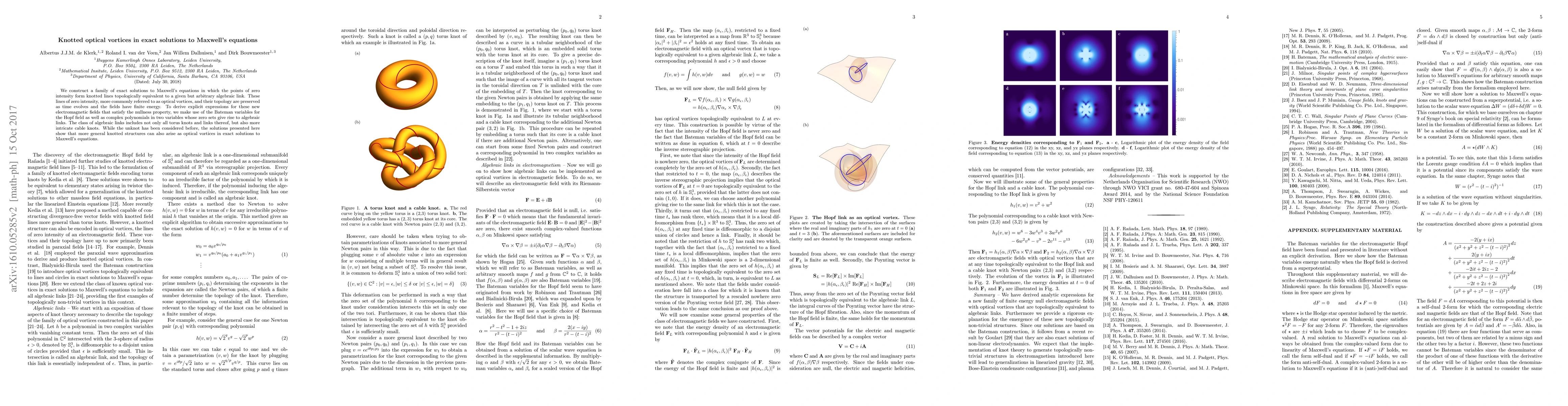 This paper presents exact solutions to Maxwell's equations featuring knotted optical vortices topologically equivalent to arbitrary algebraic links, including torus and cable knots. The solutions maintain the knotted topology over time and utilize Bateman variables and complex polynomials to derive the electromagnetic fields.