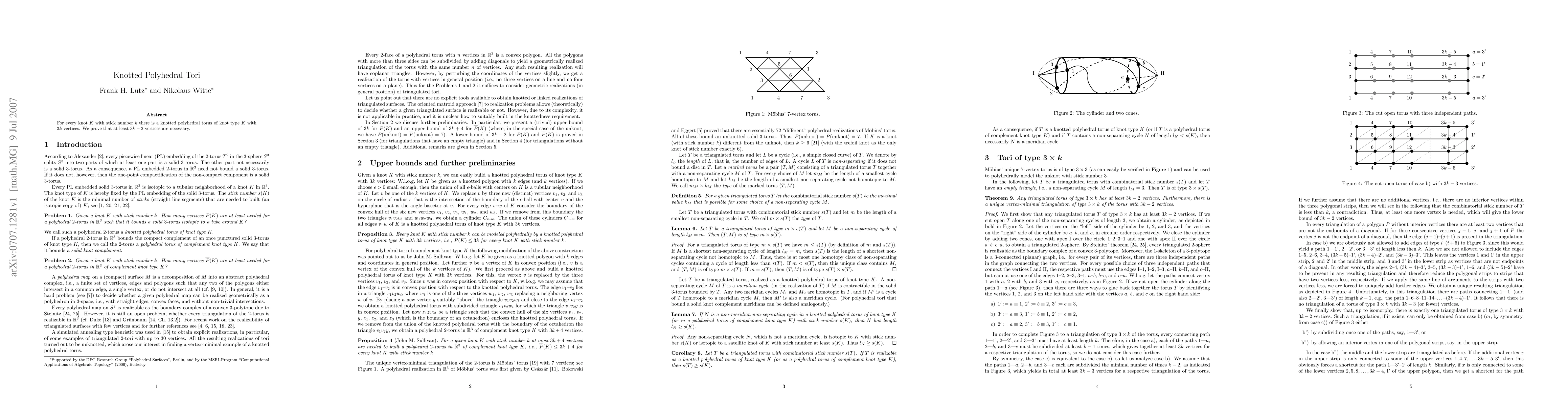 A new type of knotted polyhedral torus with 3k vertices is created for each knot K with stick number k, proving that at least 3k-2 vertices are necessary.