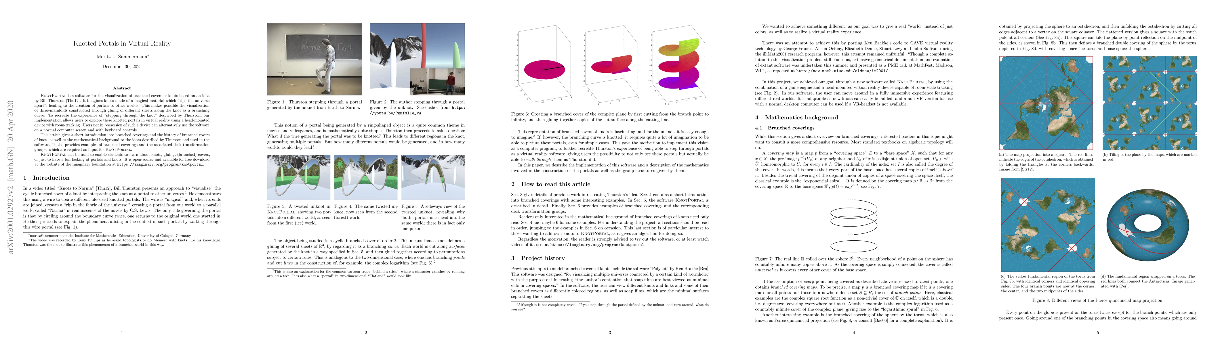 This article describes a software named "KnotPortal" for visualization of branched covers of knots based on an idea by Bill Thurston to view a knot as a portal to other universes. Our implementation allows users to explore these knotted portals either on a screen or in virtual reality using a head-mounted device with room-tracking. This allows users not only to see these glued different worlds, but experience them by being able to walk through the portals. This software can be used to enable students to learn about knots, gluing, (branched) covers, or just to have a fun look at portals.