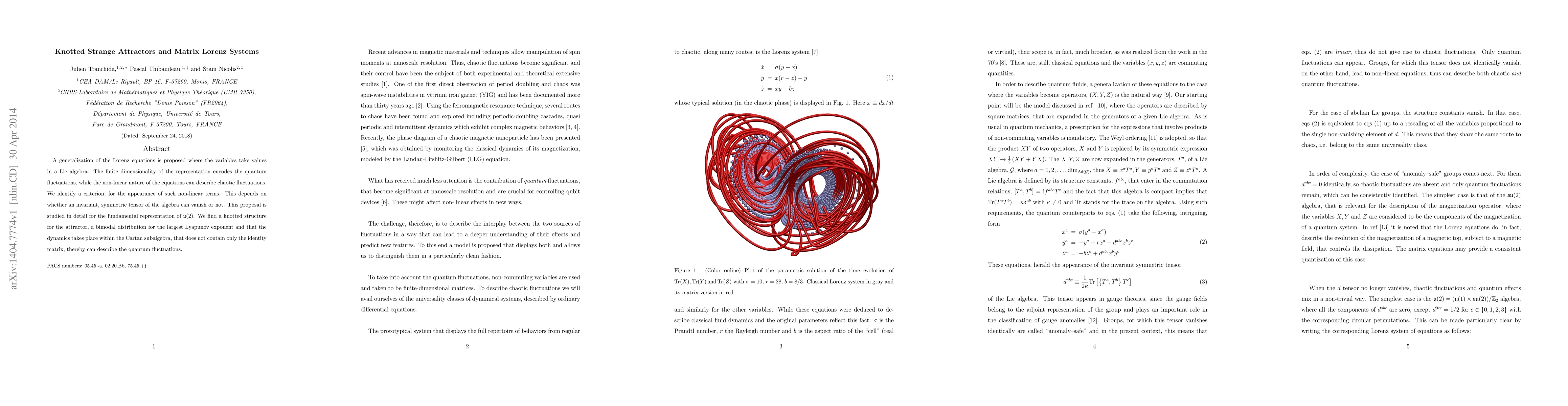 A generalization of the Lorenz equations is proposed where the variables take values in a Lie algebra. The finite dimensionality of the representation encodes the quantum fluctuations, while the non-linear nature of the equations can describe chaotic fluctuations. We identify a criterion, for the appearance of such non-linear terms. This depends on whether an invariant, symmetric tensor of the algebra can vanish or not. This proposal is studied in detail for the fundamental representation of $\mathfrak{u}(2)$. We find a knotted structure for the attractor, a bimodal distribution for the largest Lyapunov exponent and that the dynamics takes place within the Cartan subalgebra, that does not contain only the identity matrix, thereby can describe the quantum fluctuations.