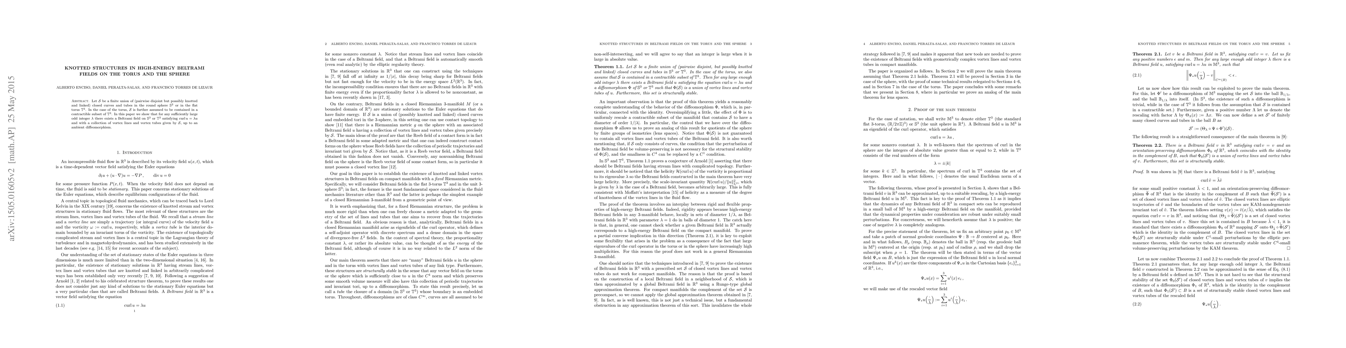 Let S be a finite union of (pairwise disjoint but possibly knotted and linked) closed curves and tubes in the round sphere S^3 or in the flat torus T^3. In the case of the torus, S is further assumed to be contained in a contractible subset of T^3. In this paper we show that for any sufficiently large odd integer \lambda there exists a Beltrami field on S^3 or T^3 satisfying curl u = \lambda u and with a collection of vortex lines and vortex tubes given by S, up to an ambient diffeomorphism.